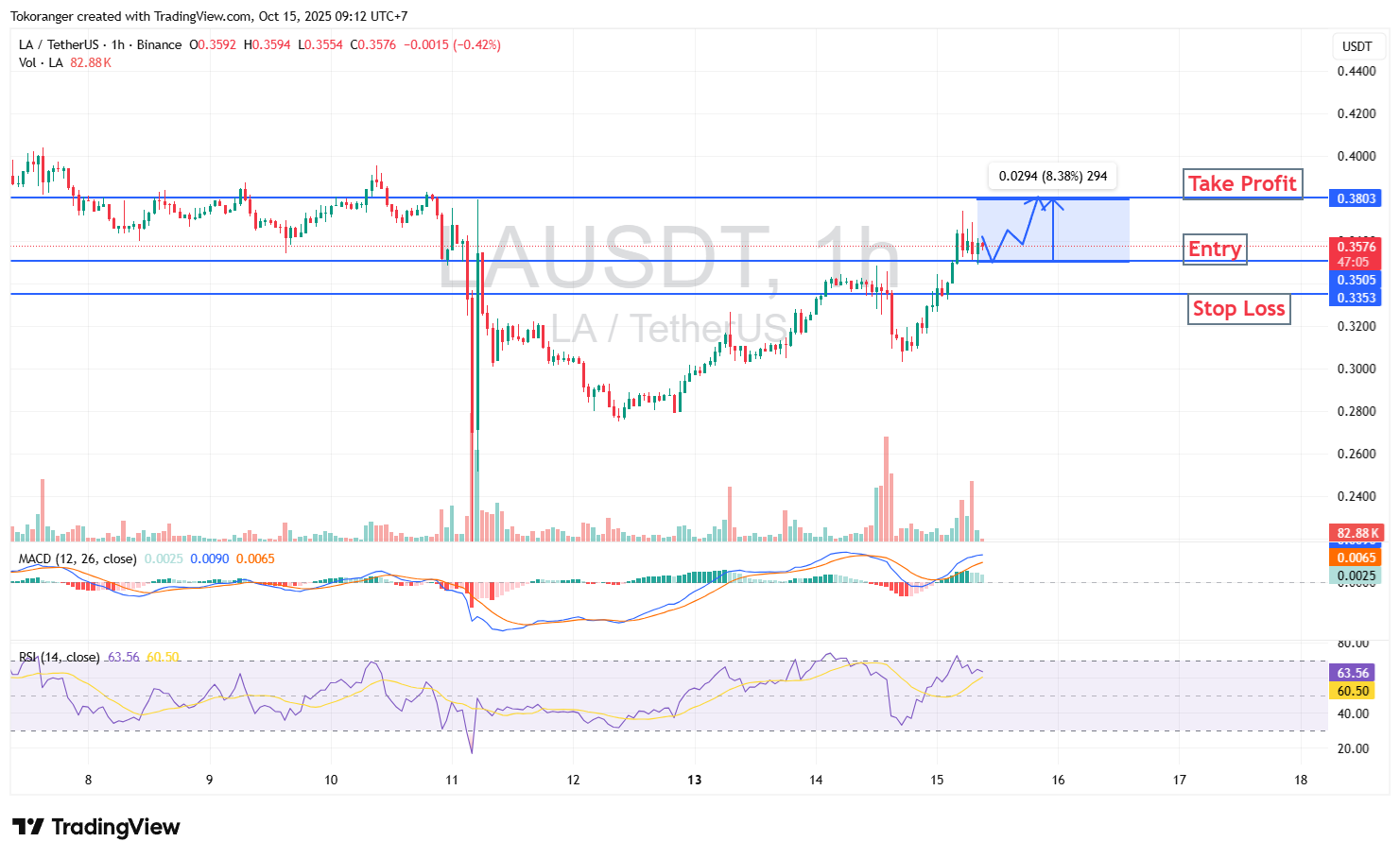 LA/USDT (1H) memperlihatkan pola bullish recovery yang mulai membentuk struktur higher low, menandakan tekanan jual mulai mereda dan pembeli mulai mengambil alih momentum. Area entry di $0.3505 berperan sebagai titik pantulan kunci menuju target take profit $0.3803, dengan potensi kenaikan sekitar 8.3%. Indikator MACD masih berada di zona positif, mendukung potensi lanjutan tren naik, sedangkan RSI 63 menunjukkan tenaga beli masih sehat tanpa tanda overbought.