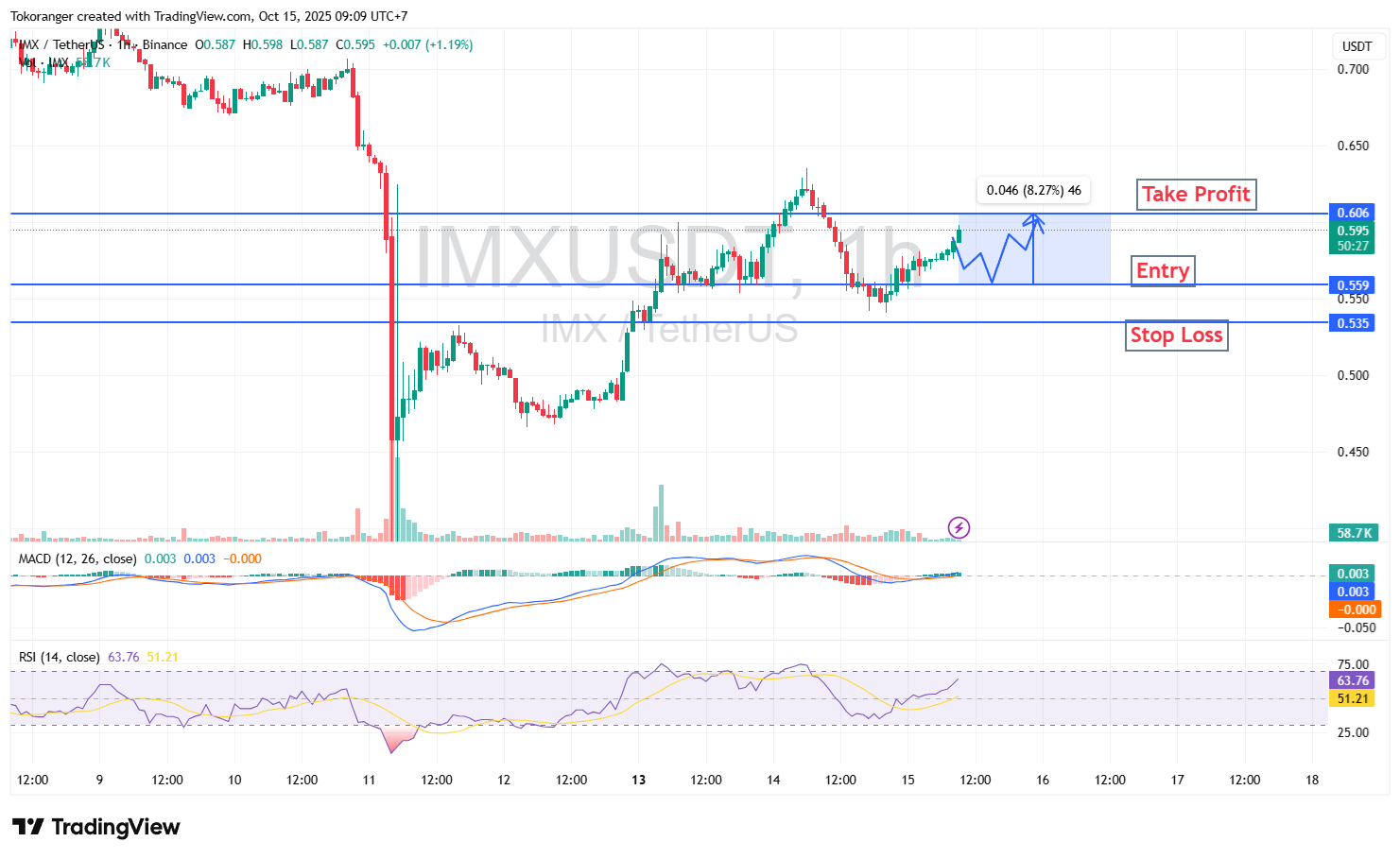 IMX/USDT (1H) sedang menunjukkan potensi rebound continuation setelah berhasil memantul kuat dari area support $0.559, menandakan minat beli mulai kembali. Indikator MACD baru saja melintasi area positif, memperkuat momentum bullish, sementara RSI di 64 menunjukkan kekuatan tren tanpa tanda jenuh beli ekstrem.