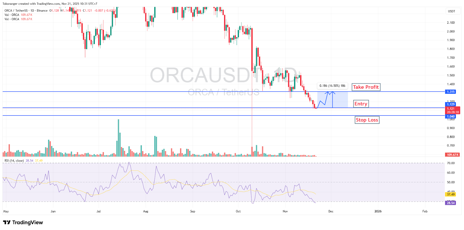 ORCA sedang mencoba bangkit dari zona demand $1.04- $1.12, area yang sebelumnya sering menjadi titik pantul harga. Struktur harga yang terus menurun kini mulai menunjukkan tanda “melemah”, ditandai munculnya candle rejection di support dan RSI daily yang sudah berada di area oversold (28).