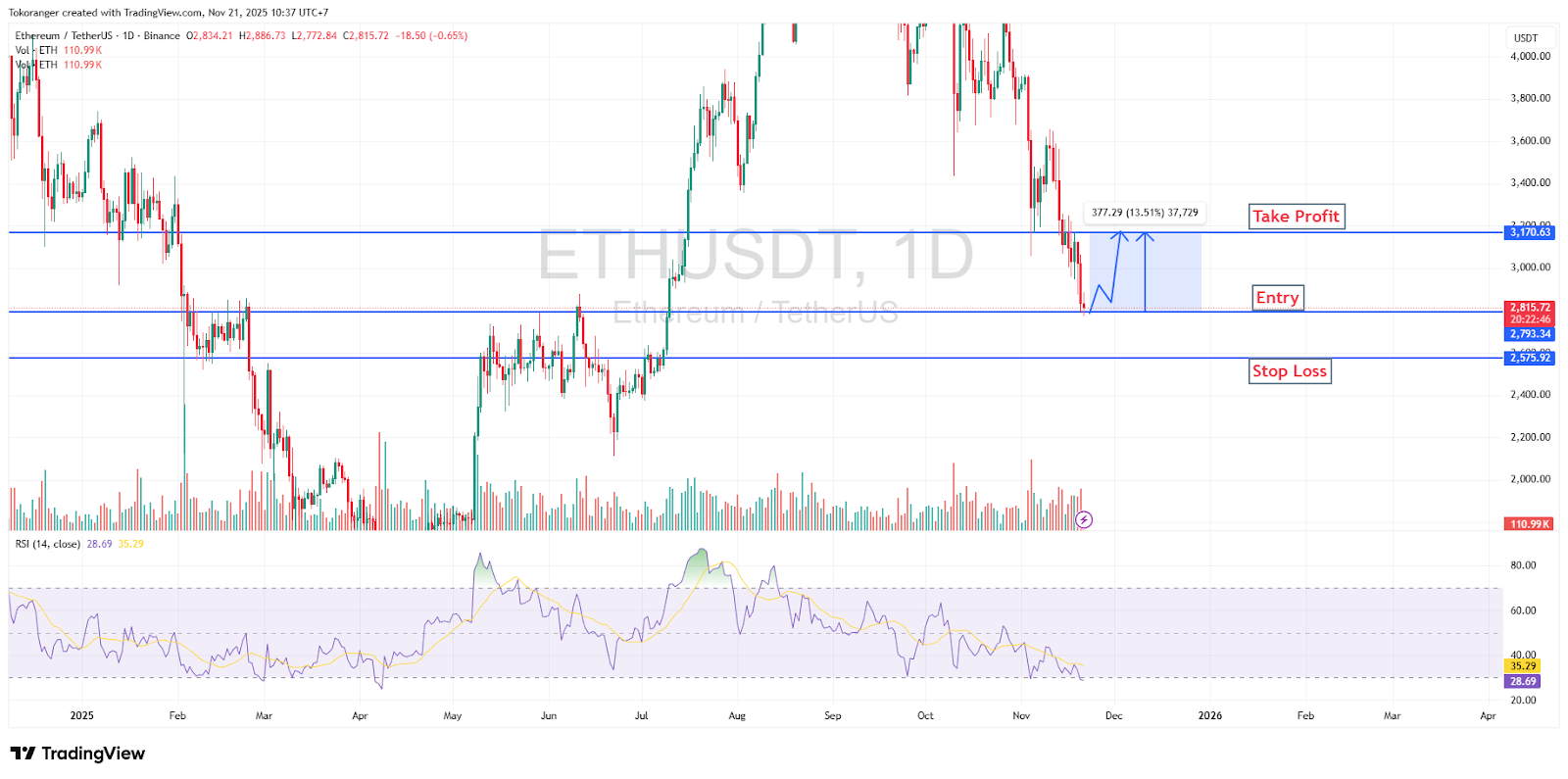 Selama ETH bertahan di atas 2.790, peluang menuju zona pantauan 3.150 masih terbuka ini area yang biasanya jadi tempat buyer menguji kekuatan tren baru. RSI yang sudah sangat rendah juga memberi gambaran bahwa pasar mulai memasuki fase jenuh jual.
