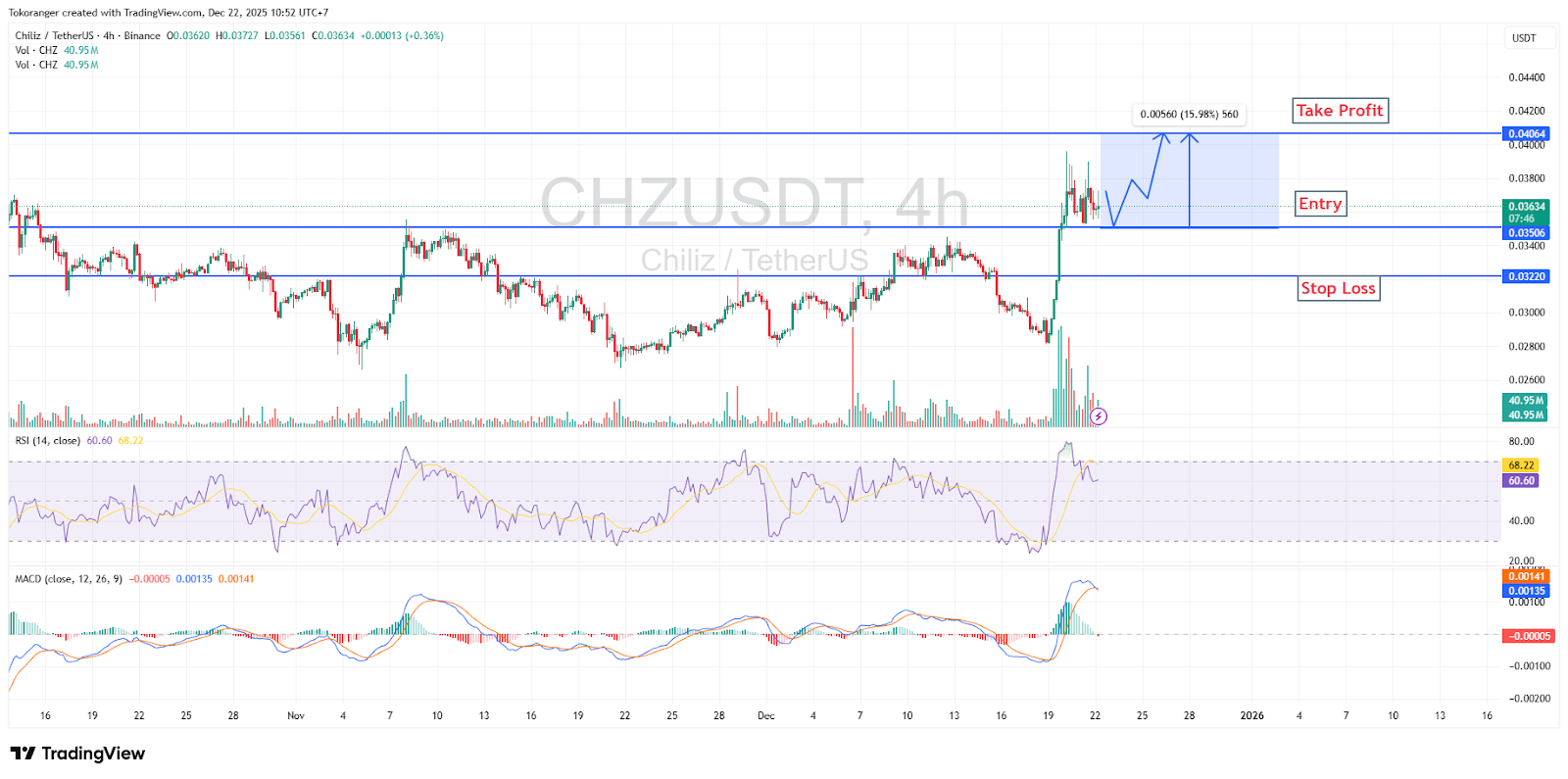 CHZ/USDT di timeframe 4H harga bertahan di area support sekitar $0.0350-$0.0360 dan berhasil breakout kecil ke $0.0363, membuka peluang lanjut naik ke resistance $0.0406. RSI berada di sekitar 60 (masih sehat, belum overbought) dan MACD mulai mengarah naik, tanda tenaga bullish mulai hidup.