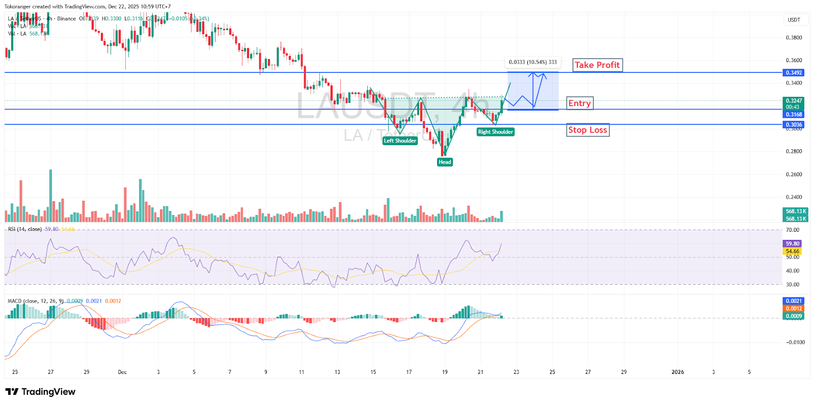Secara singkat, LA/USDT terlihat sedang membangun potensi reversal bullish setelah membentuk pola head and shoulders terbalik di area support $0.3168-$0.3036. Harga saat ini bertahan di sekitar $0.3253, menandakan buyer mulai mengambil alih.
