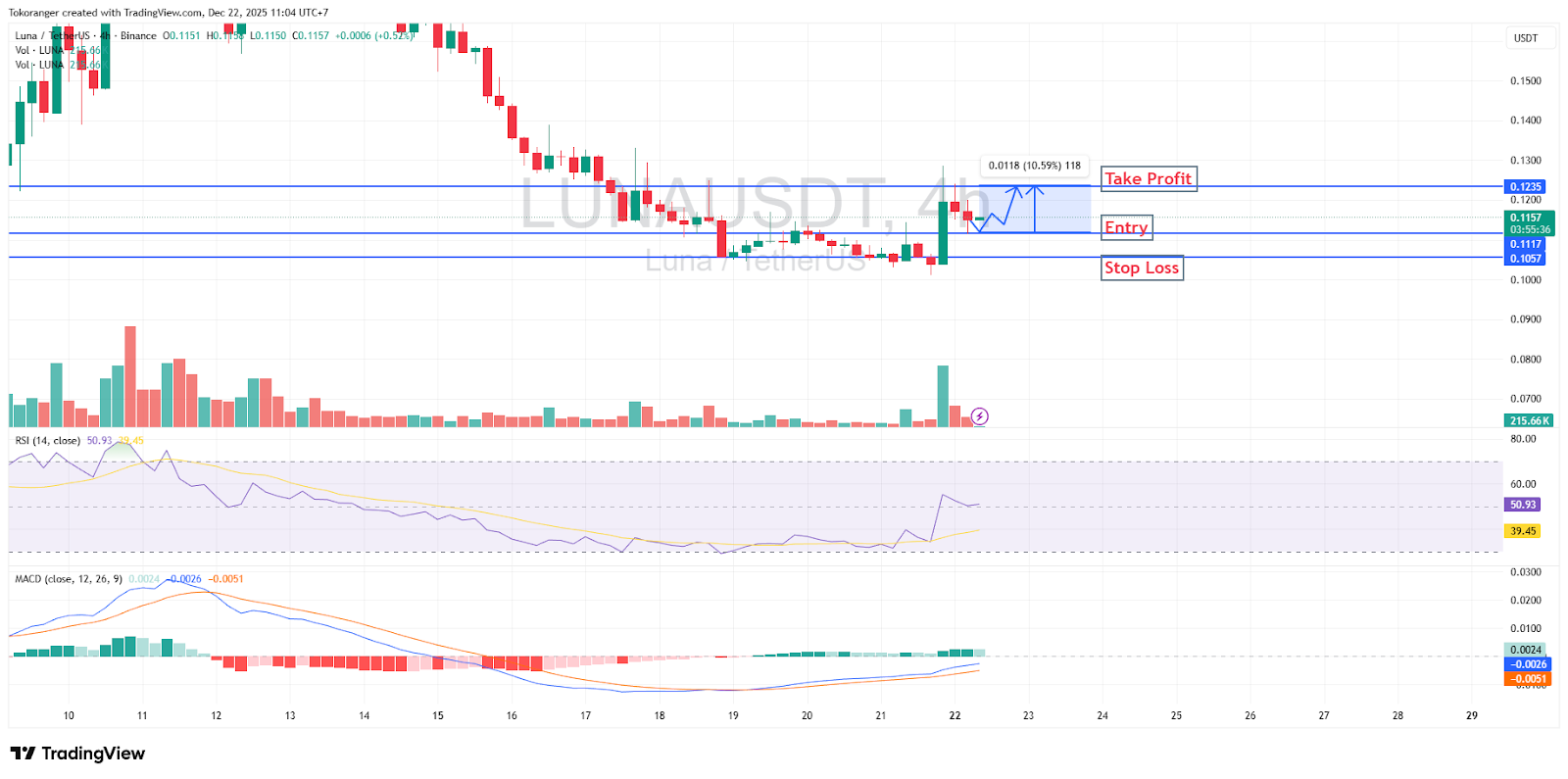 LUNA/USDT (4H) terlihat sedang mencoba bangkit setelah fase turun panjang, dengan harga bertahan di area support $0.1117-$0.1057 dan mulai memantul menuju entry $0.1153. Secara sederhana, ini seperti bola yang jatuh lalu memantul selama tidak menembus stop loss $0.1057, peluang rebound masih terbuka.