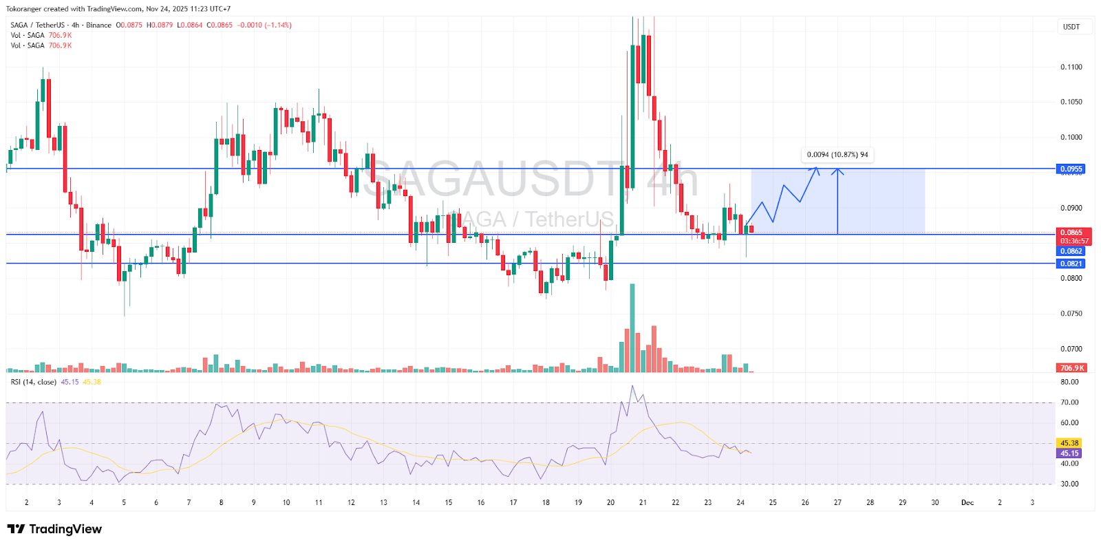 SAGA/USDT saat ini bergerak seperti “rute perjalanan” yang sedang menguji ulang titik pemberangkatan di area 0.0862 sebelum berpotensi melanjutkan perjalanan ke “pos tujuan” di 0.0955, selama harga tetap bertahan di atas “zona aman” 0.0821 sebagai Stop Loss. Struktur harga masih sideways dengan pola higher-low kecil, sementara RSI berada di kisaran 45 yang artinya tenaga beli mulai pulih tetapi belum agresif.
