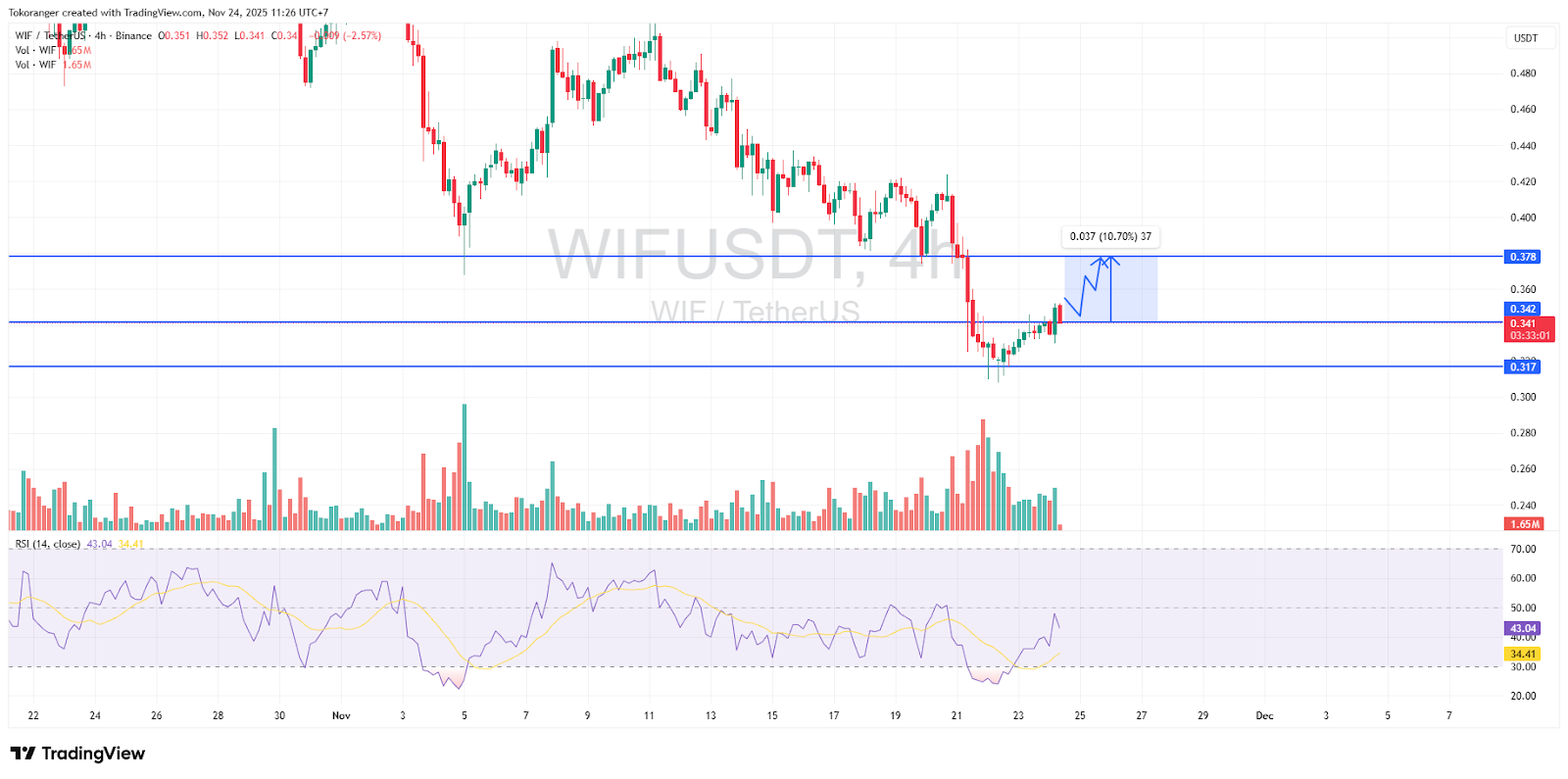 WIF/USDT saat ini seperti “baru bangun dari tidur panjang” setelah memantul kuat dari area support 0.317 di mana tekanan jual sebelumnya mulai melemah. Kenaikan volume hijau dan RSI yang berbalik naik dari level jenuh jual memberi sinyal awal bahwa pembeli mulai mengambil alih kendali. Selama harga tetap bertahan di atas zona entry 0.342, peluang kenaikan menuju resistance 0.378 terbuka lebar sebagai target ambil untung terdekat.