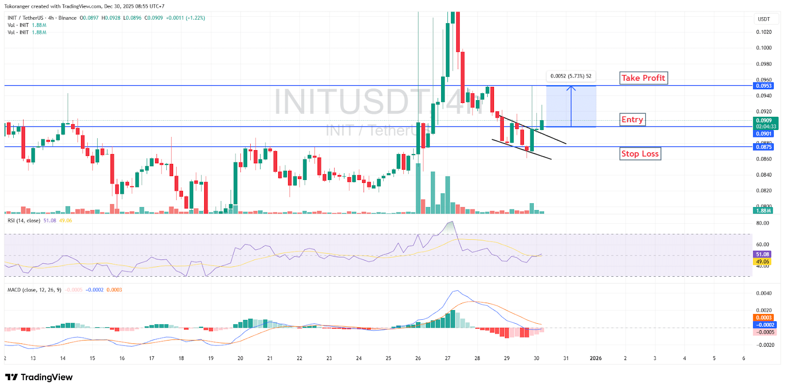 Dari sisi struktur harga, INIT membentuk pola falling wedge yang sudah mengalami breakout tipis, membuka peluang lanjutan kenaikan apabila mampu bertahan di atas area kunci. Strategi yang dapat dipantau adalah entry di 0,0901, dengan target take profit di 0,0953 dan stop loss di 0,0875, sehingga memberikan estimasi potensi profit sekitar 5,73%.