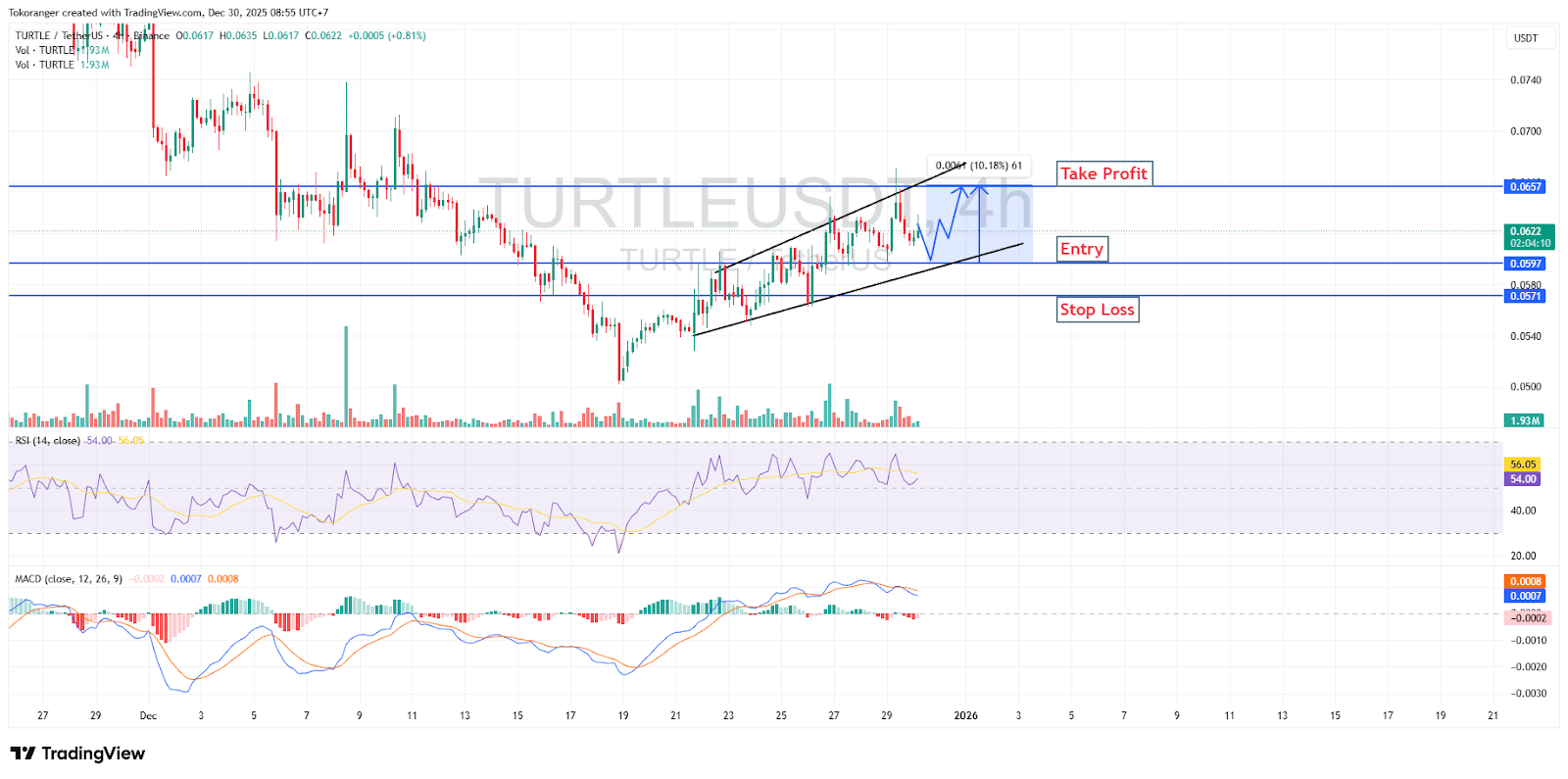 MACD masih berada di fase bullish namun mulai koreksi, sehingga dalam jangka pendek harga berpotensi turun lebih dulu untuk menguji area entry di 0,0597. Apabila area ini mampu bertahan, peluang lanjutan kenaikan tetap terbuka dengan target take profit di 0,0657 dan stop loss di 0,0571, memberikan estimasi potensi profit sekitar 10,18%.
