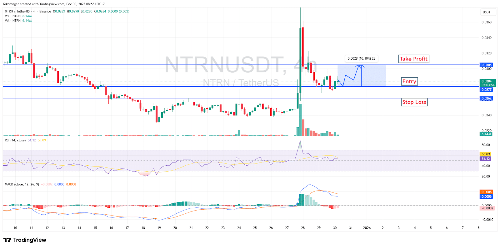 NTRN/USDT pada timeframe 4 jam saat ini masih berpotensi koreksi, namun area ini tetap menarik karena sebelumnya terjadi breakout besar dengan volume tinggi. Strategi yang bisa dipantau adalah entry di 0,0277, stop loss di 0,0262, dan take profit di 0,0305. MACD masih bullish tapi sedang koreksi, RSI juga melemah sementara setelah tekanan jual, yang bisa menjadi ruang untuk dorongan naik berikutnya. Volume memang menurun, namun masih cukup stabil,
