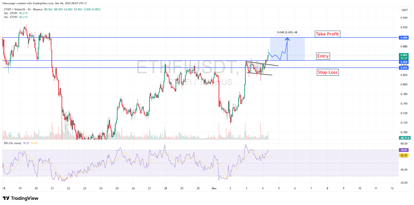 ETHFI saat ini memperlihatkan sinyal kenaikan yang cukup rapi setelah membentuk pola bullish continuation di area konsolidasi $0.85-$0.86. Candle yang menembus garis tren miring menandakan momentum beli mulai menguat, apalagi RSI bergerak mantap di atas zona 60 yang biasanya menjadi “bahan bakar” awal fase bullish. Selama harga tetap bertahan di atas area entry $0.850, peluang ETHFI untuk melanjutkan kenaikan menuju resistance kuat $0.898.