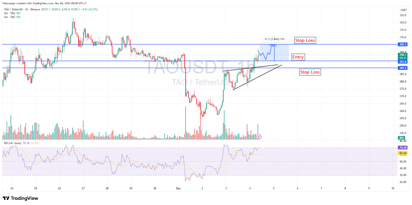 TAO saat ini memperlihatkan pola pendakian yang rapi melalui pembentukan rising wedge kecil, yang menandakan tenaga beli sedang memaksa harga mendekati area resistensi kunci di $305.2.