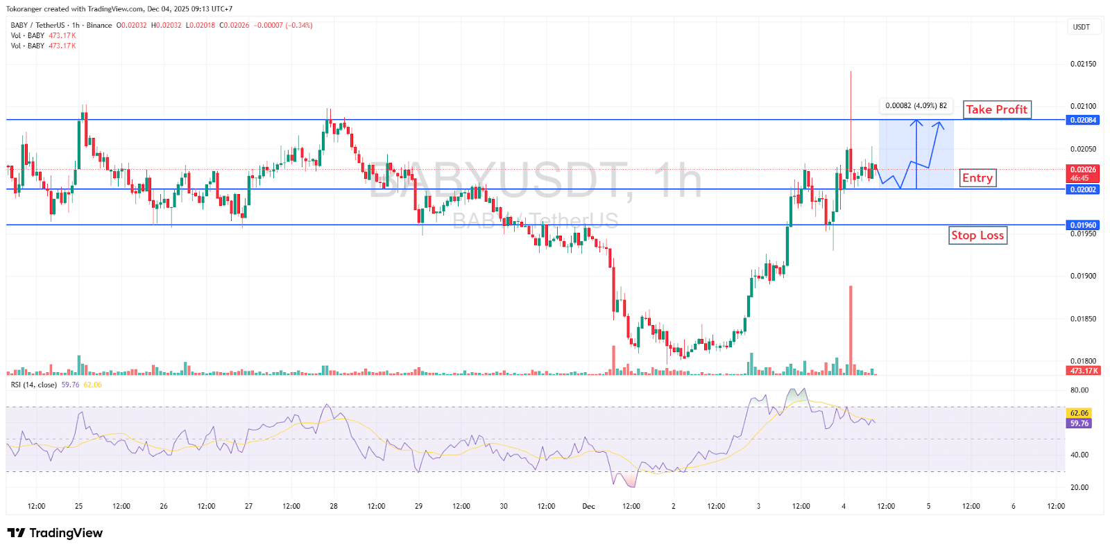 BABY saat ini bergerak seperti harga yang baru saja menemukan support di area support $0.02002, lalu mencoba memanjat kembali menuju zona resistance $0.02084 yang menjadi tembok penting berikutnya. Struktur candlenya menunjukkan pola pullback sehat turun sebentar, lalu naik lagi yang biasanya menjadi tanda bahwa buyer mulai mengambil alih momentum. RSI berada di sekitar 59-62, artinya kekuatan beli masih wajar dan belum masuk area panas (overbought).