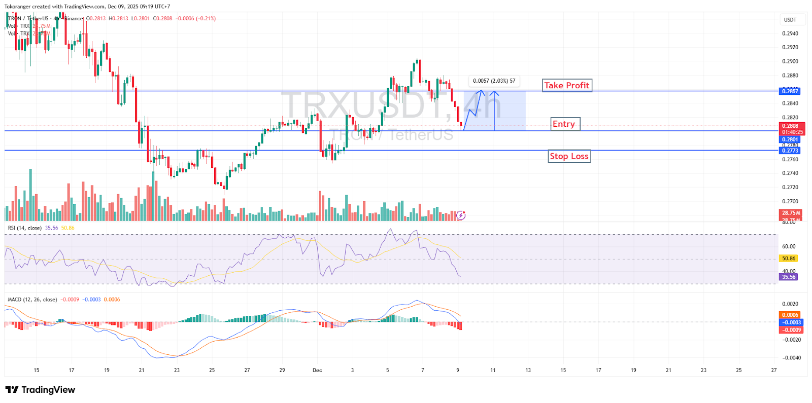 TRX saat ini sedang menguji zona permintaan (support) $0.2780-$0.2800 setelah penurunan cepat.. RSI 1H juga turun ke area jenuh jual sehingga peluang rebound makin terbuka, sementara MACD mulai melambat turun tanda bahwa tekanan jual melemah. Selama harga mampu bertahan di atas $0.2773, skenario pemulihan menuju resistance $0.2857 menjadi jalur yang paling logis.