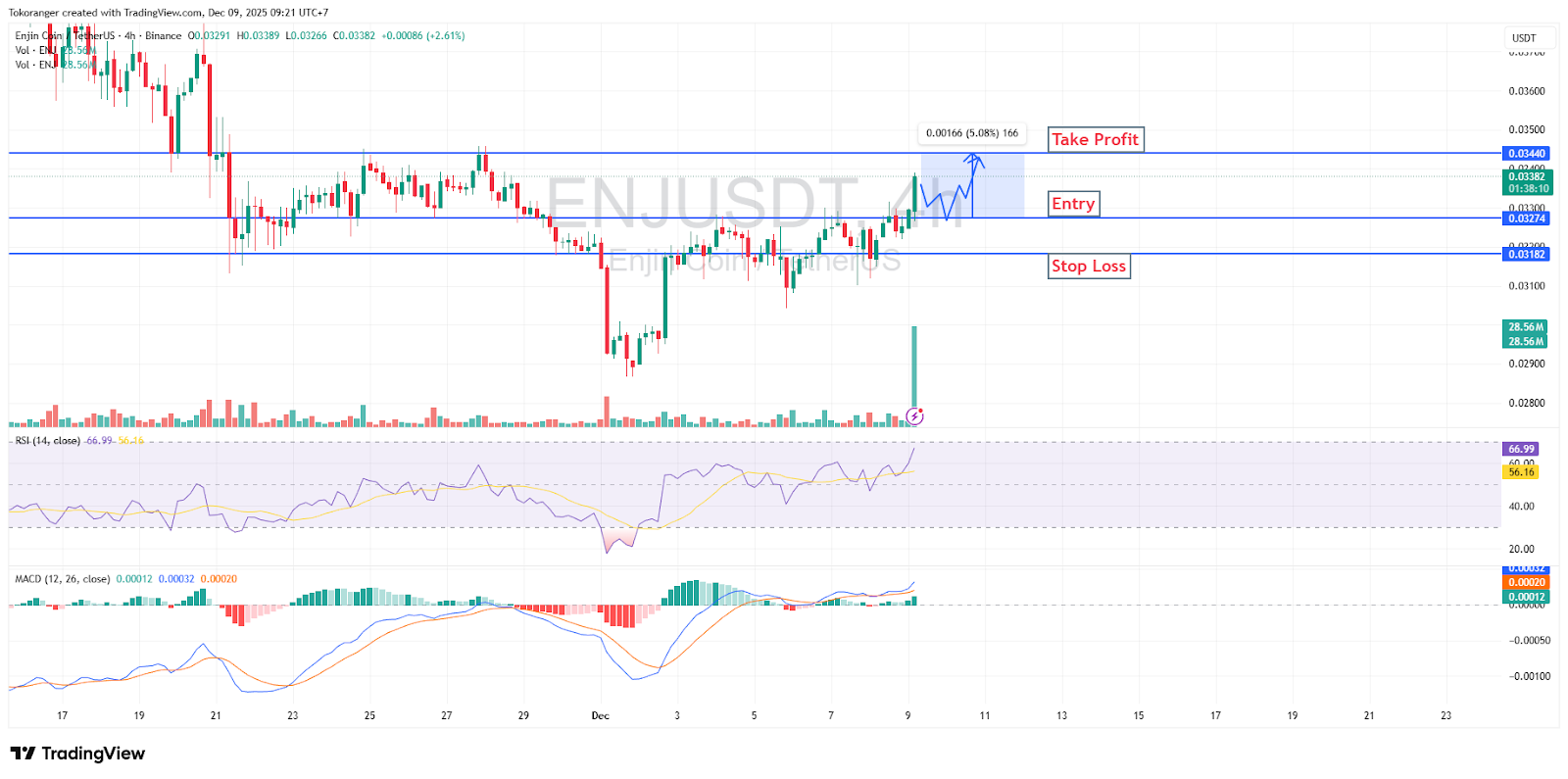 ENJ/USDT saat ini menunjukkan rebound sehat setelah penolakan kuat dari area demand $0.03180-$0.03270, di mana candle impulsif ber-volume tinggi menandakan masuknya buyer baru. Jika harga mampu bertahan di atas zona entry tersebut, peluang melanjutkan pendakian menuju resistance $0.03440 terbuka lebar, apalagi RSI yang kembali naik dari zona netral mengisyaratkan momentum bullish mulai pulih. MACD pun mulai membentuk kurva positif, memperkuat potensi lanjutan tren naik jangka pendek.
