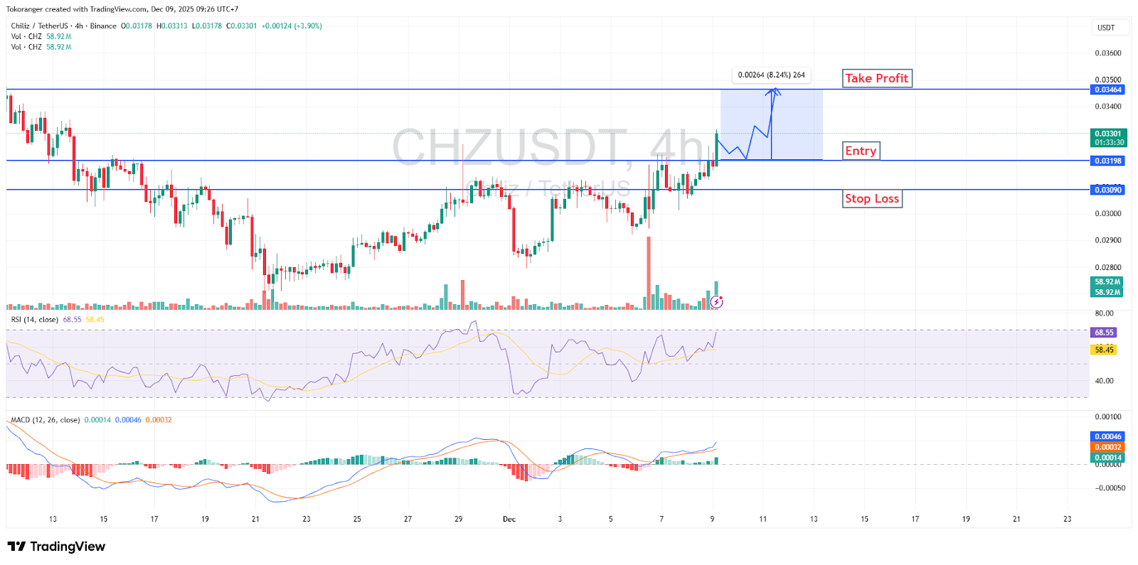 CHZ terlihat mulai bangkit dari zona demand 0.03198 dan membangun pola yang menandakan buyer perlahan mengambil alih momentum. Break kecil di atas struktur minor memberi sinyal bahwa harga siap melakukan retest rebound menuju resistance kuat $0.03464 sebagai area Take Profit. Selama candle tetap bertahan di atas level Entry $0.03198 dan tidak kembali jatuh menembus support 0.03090 (Stop Loss), maka skenario kenaikan ini tetap valid. RSI yang menanjak mendekati area bullish serta MACD yang mulai membuka momentum positif.