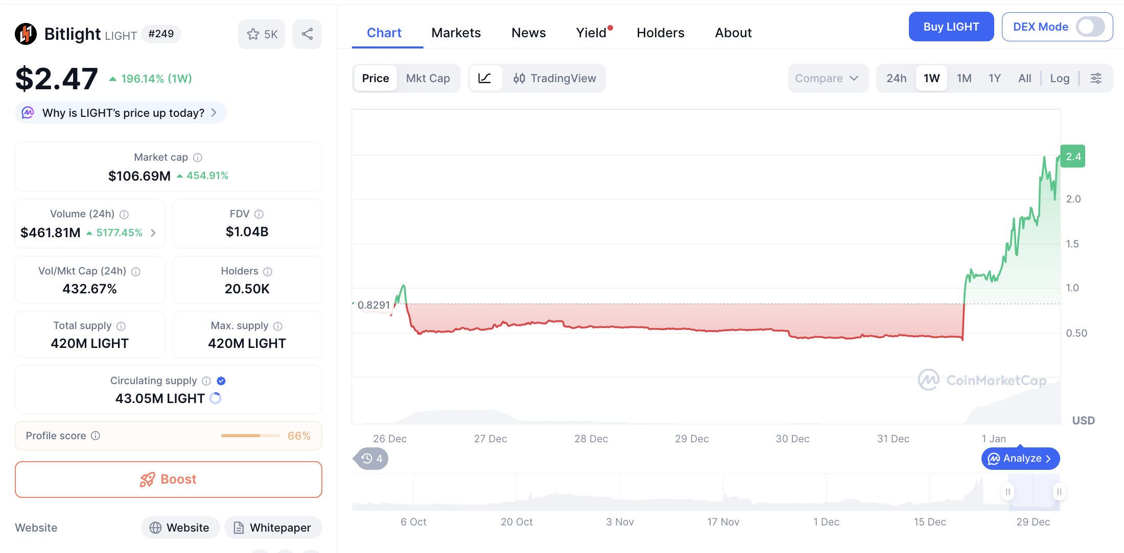 Di posisi berikutnya, Bitlight (LIGHT) mencatat performa paling agresif dari sisi kenaikan harian. Harga LIGHT berada di level $2.47, dengan lonjakan ekstrem 453.91% dalam 24 jam dan kenaikan 195.96% dalam 7 hari.