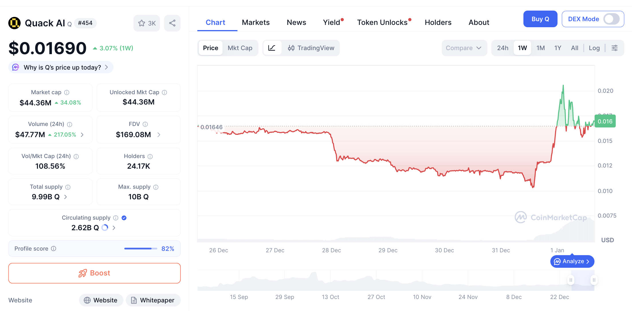 Kapitalisasi pasar Quack AI berada di angka $44,054,994, dengan volume transaksi harian mencapai $47,861,712. Total suplai beredar Q tercatat sebesar 2.92 miliar token, menjadikannya salah satu proyek dengan suplai terbesar di kategori ini.