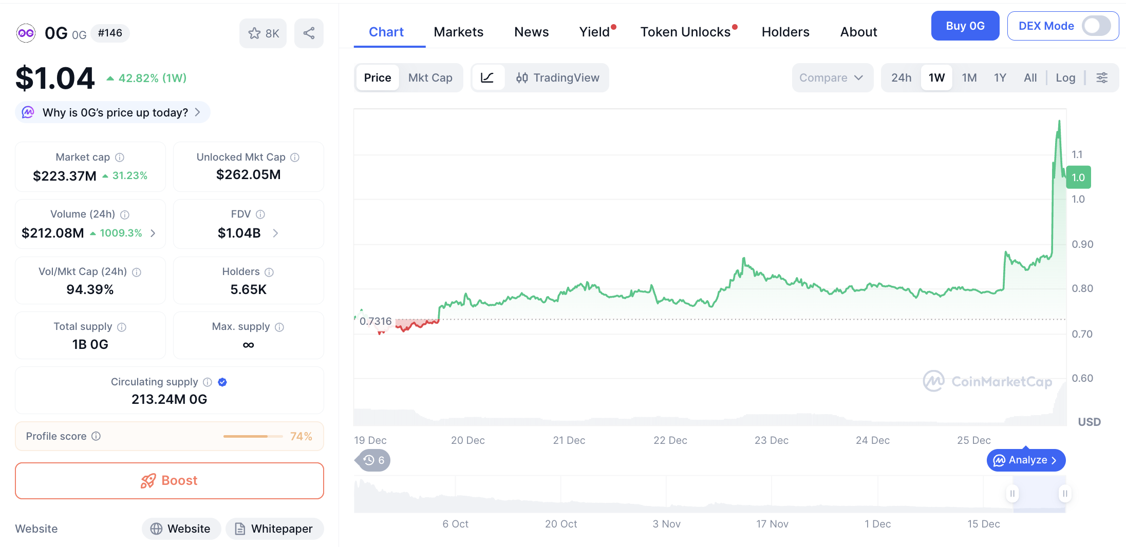 Kapitalisasi pasar 0G mencapai $223,627,120, dengan volume perdagangan harian sebesar $210,748,337. Total pasokan beredar berada di kisaran 200.27 juta token, menjadikan 0G sebagai salah satu aset DePIN paling likuid di pasar.