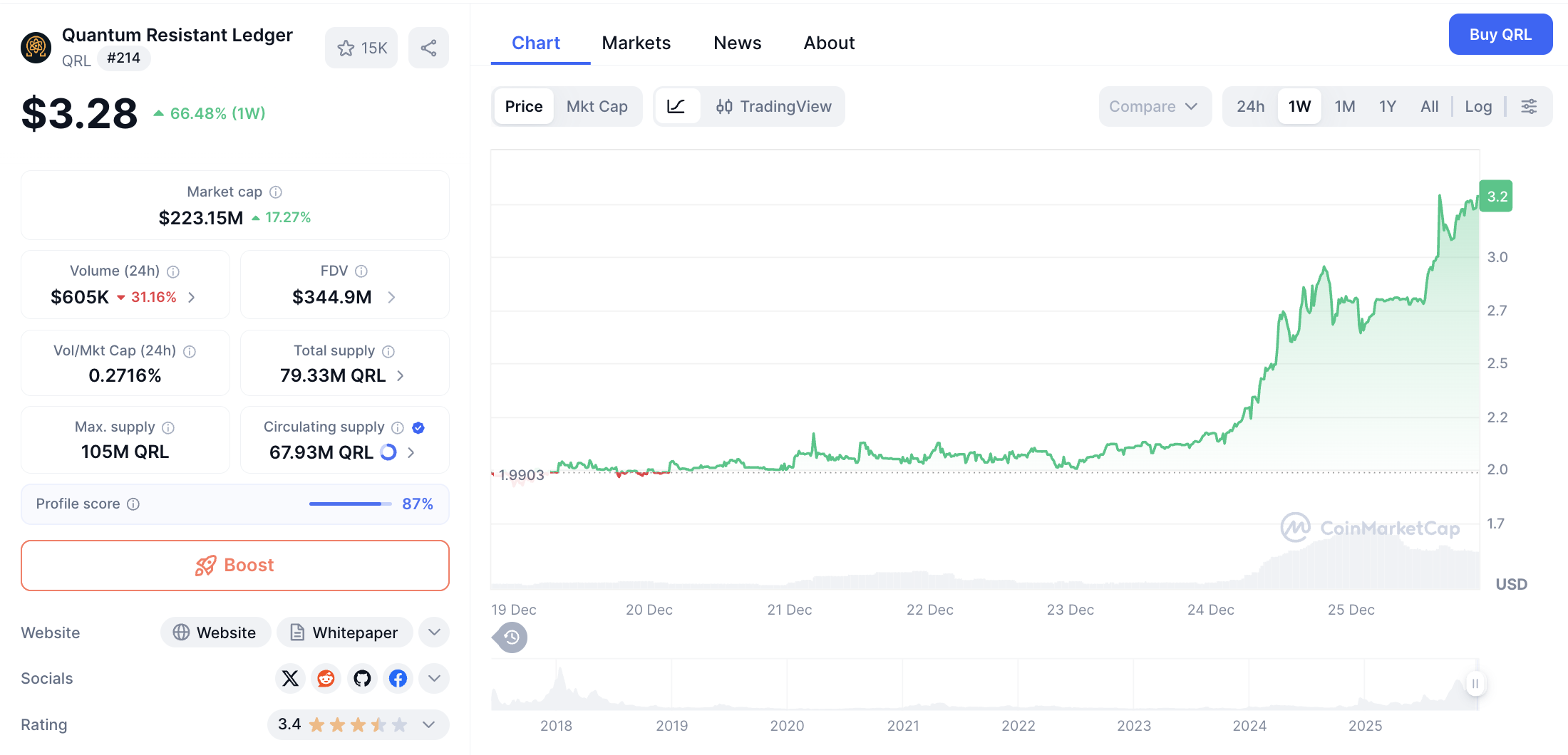 Di posisi berikutnya ada QRL, token DePIN yang fokus pada keamanan jaringan tahan komputasi kuantum. QRL diperdagangkan di harga $3.28, menguat 20.52% dalam 24 jam dan melonjak 66.37% selama 7 hari.