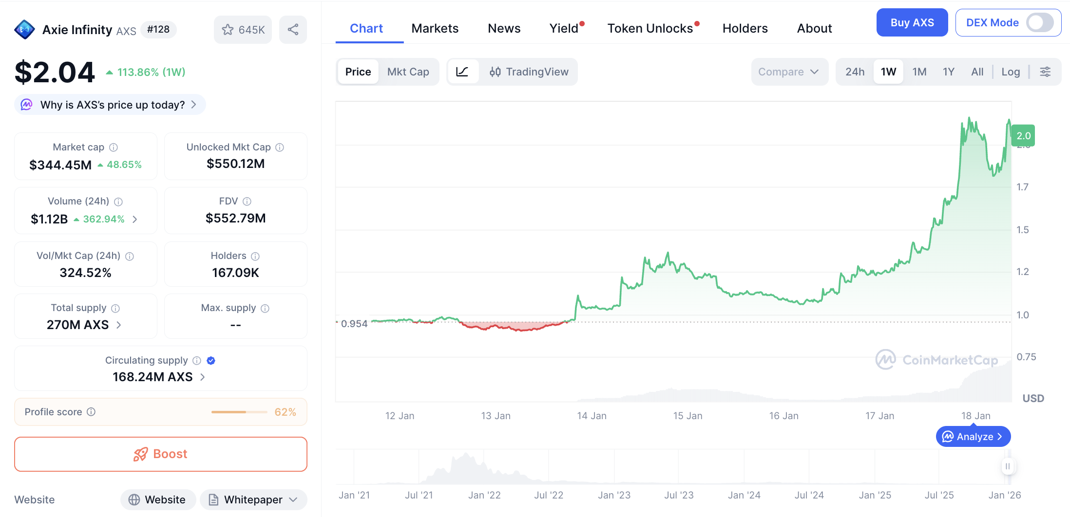 Kapitalisasi pasar AXS tercatat sebesar $346,831,549, dengan volume perdagangan harian mencapai $1,125,698,440. Lonjakan ini menjadikan AXS sebagai salah satu token P2E paling aktif diperdagangkan saat ini, dengan suplai beredar sekitar 168.24M AXS.