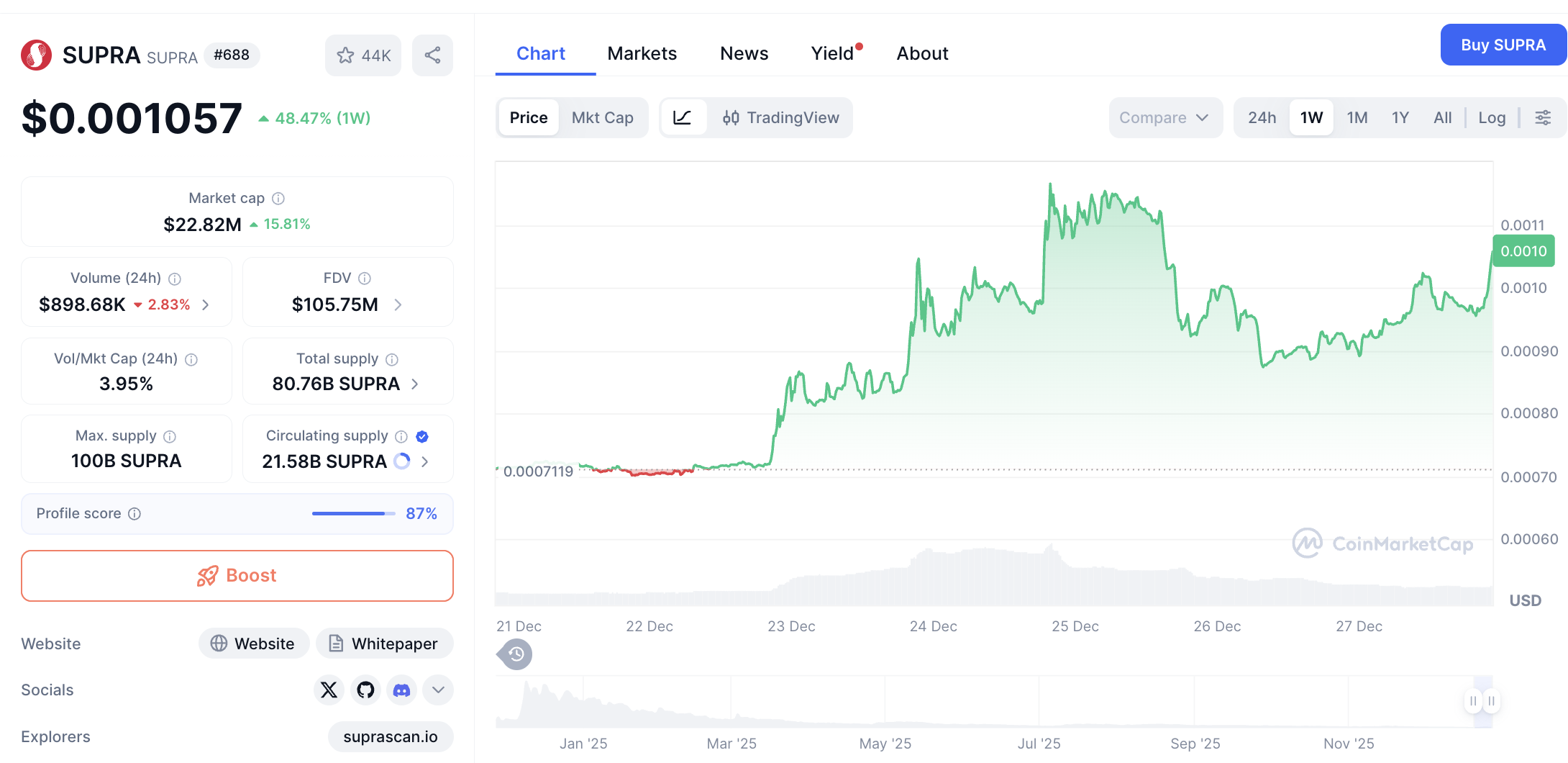 Kapitalisasi pasar SUPRA mencapai $22,169,922 dengan volume transaksi harian sebesar $868,983. Saat ini, suplai beredar SUPRA berada di angka 21.58B token, menjadikannya salah satu proyek oracle dengan likuiditas tinggi.