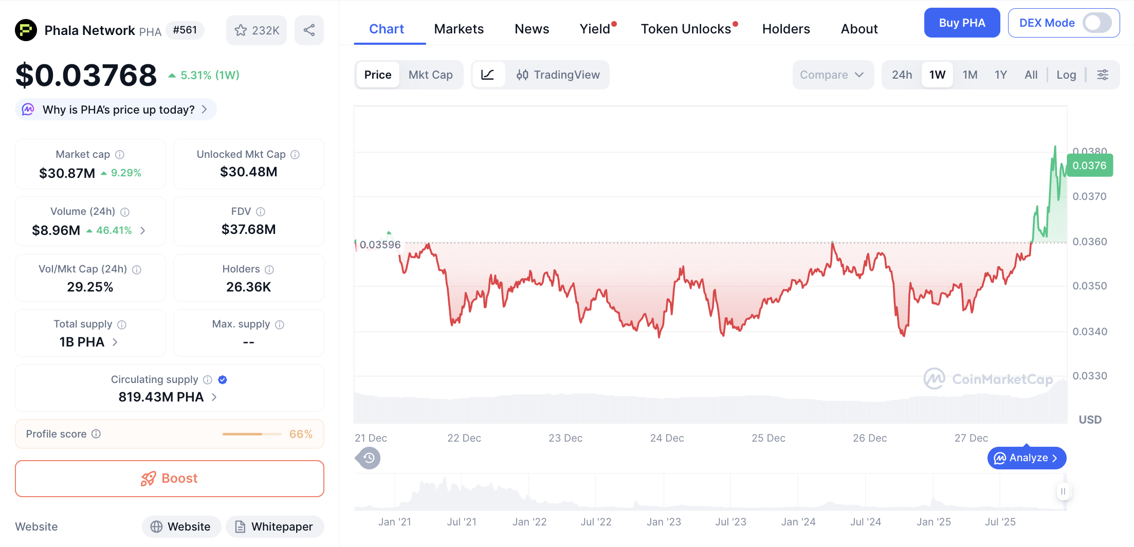 Phala Network menempati posisi berikutnya dengan harga $0.03754. Dalam 24 jam terakhir, PHA mengalami kenaikan 8.93%, sementara dalam periode 7 hari tercatat naik 4.24%.