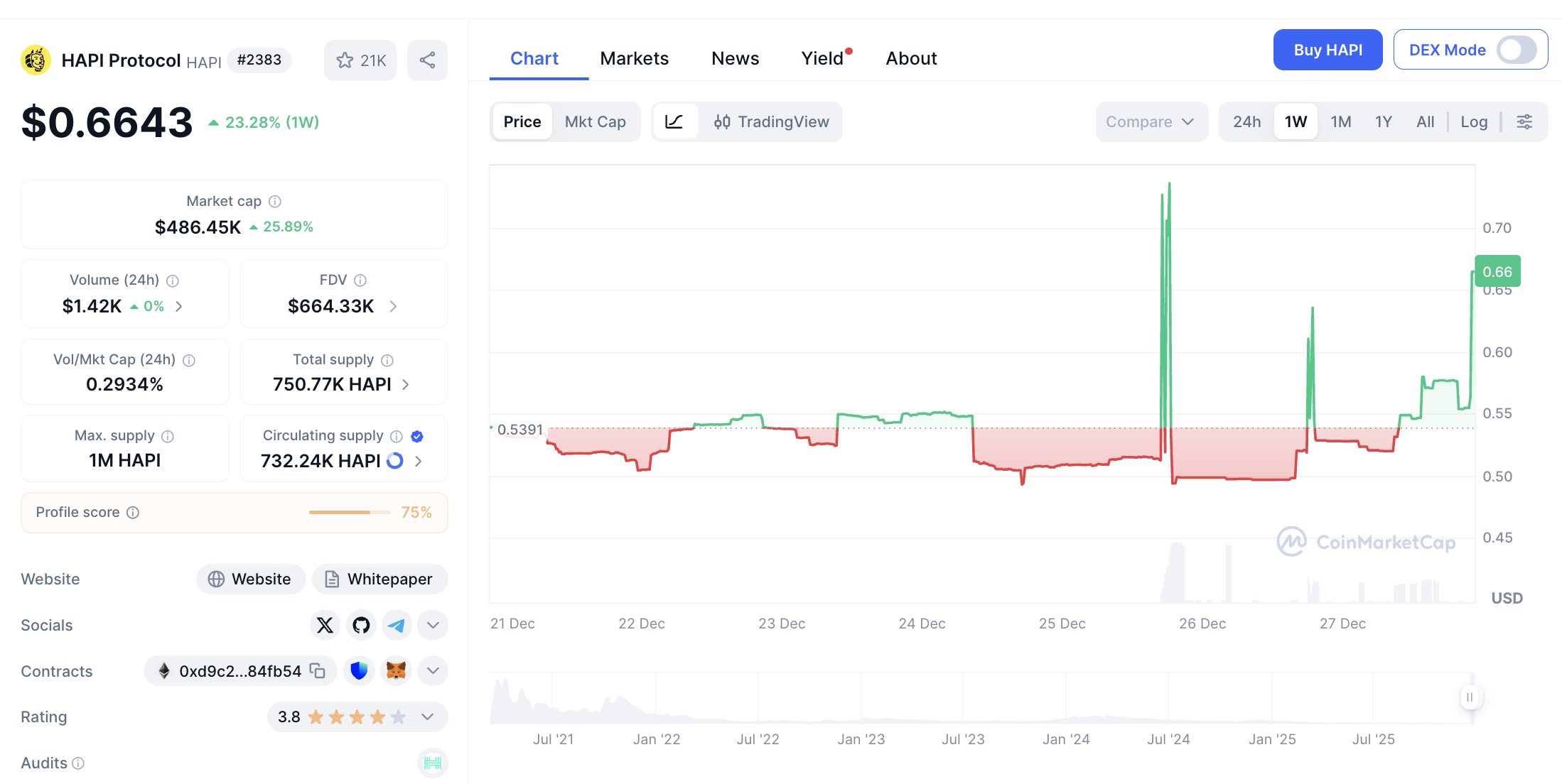 HAPI Protocol mencatat performa impresif dengan harga $0.6643. Token ini mengalami lonjakan 25.89% dalam 24 jam dan naik 23.30% dalam 7 hari terakhir.