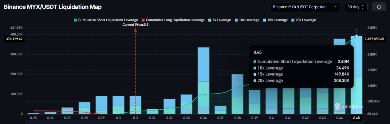 Jika harga MYX turun di bawah level US$0,45, likuidasi sekitar US$2,6 juta dapat terjadi di pasar futures. Kondisi ini menunjukkan banyak trader memposisikan diri untuk penurunan harga lebih lanjut.
