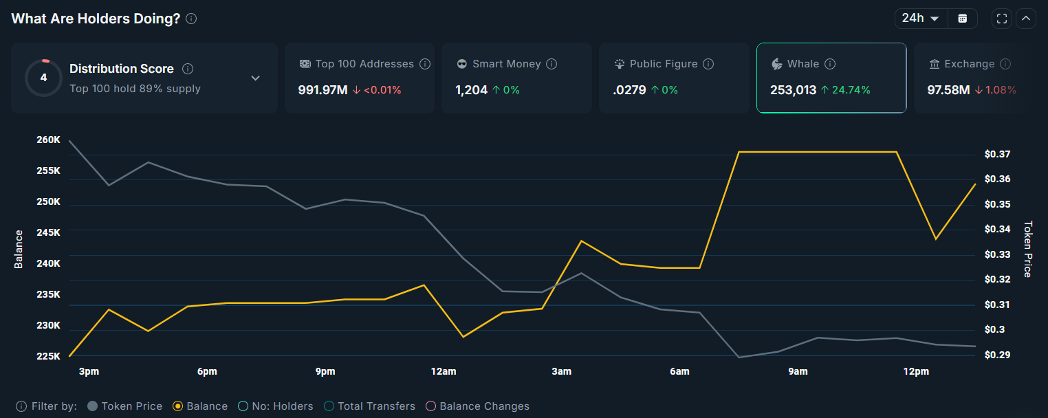 Di tengah kondisi pasar yang lemah, investor besar atau whale mulai meningkatkan kepemilikan mereka. Data menunjukkan alamat yang memegang lebih dari US$1 juta dalam MYX telah meningkatkan kepemilikannya sekitar 24%.