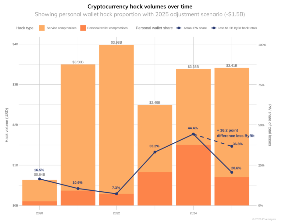 Namun demikian, data Chainalysis menunjukkan bahwa peretasan dompet pribadi semakin menjadi ancaman serius. Pada 2025, 37% dari total nilai kripto yang dicuri berasal dari kompromi dompet pribadi, jika peretasan besar Bybit senilai US$1,4 miliar dikecualikan.