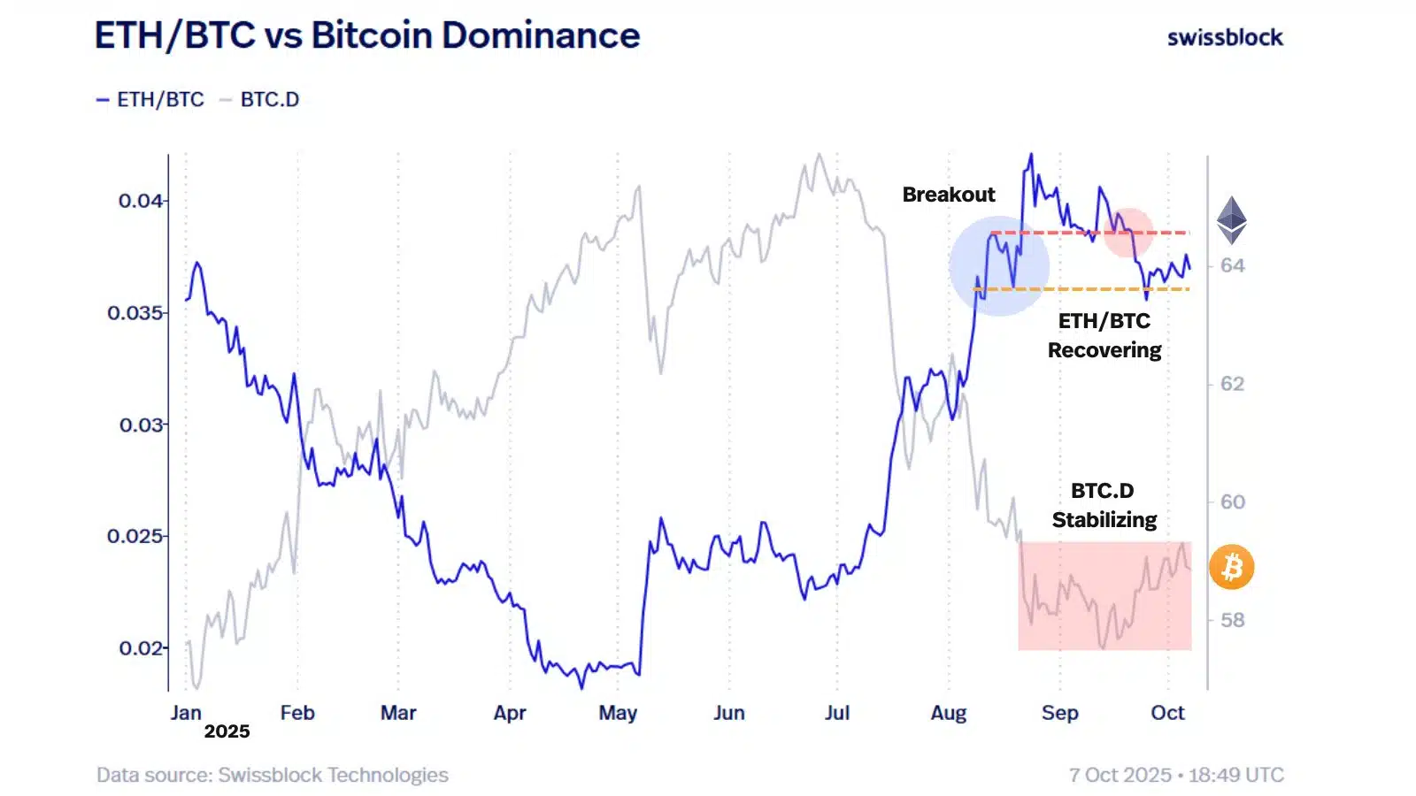 Analis dari Swissblock mencatat bahwa dominasi Bitcoin (BTC) saat ini masih terkonsolidasi di bawah 60%, menandakan potensi bagi Ethereum (ETH) untuk memimpin pergerakan berikutnya.