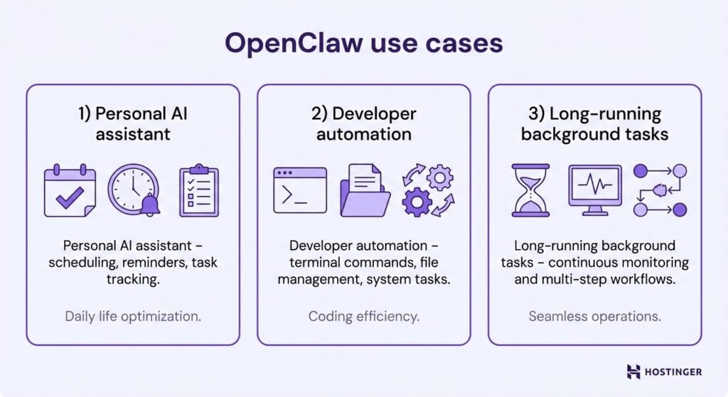 Dalam penggunaan praktis, OpenClaw dapat membantu penjadwalan, pengingat, dan riset secara mandiri. Ia mampu menjalankan perintah terminal, mengelola file, memantau proses sistem, serta mengotomasi tugas-tugas berulang. Bahkan, OpenClaw dapat menjalankan workflow berkelanjutan selama berhari-hari sambil memberikan update dan notifikasi saat dibutuhkan.