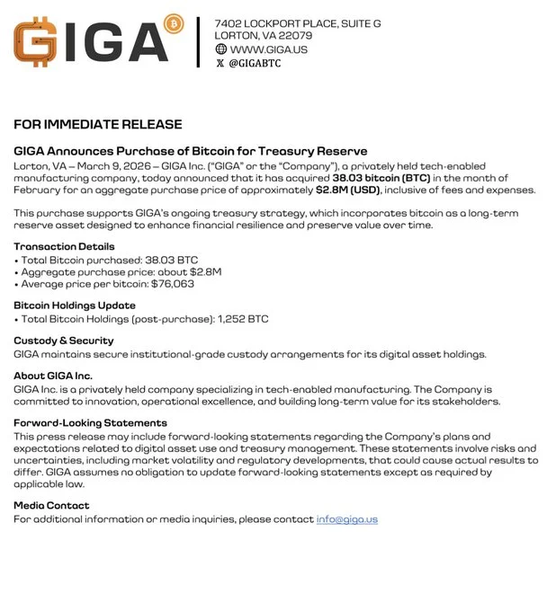Perusahaan manufaktur swasta GIGA kembali menambah cadangan Bitcoin dalam neraca keuangannya. Perusahaan tersebut mengungkapkan telah membeli tambahan 38 BTC pada bulan lalu, sehingga total kepemilikan Bitcoin mereka kini mencapai 1.252 BTC.