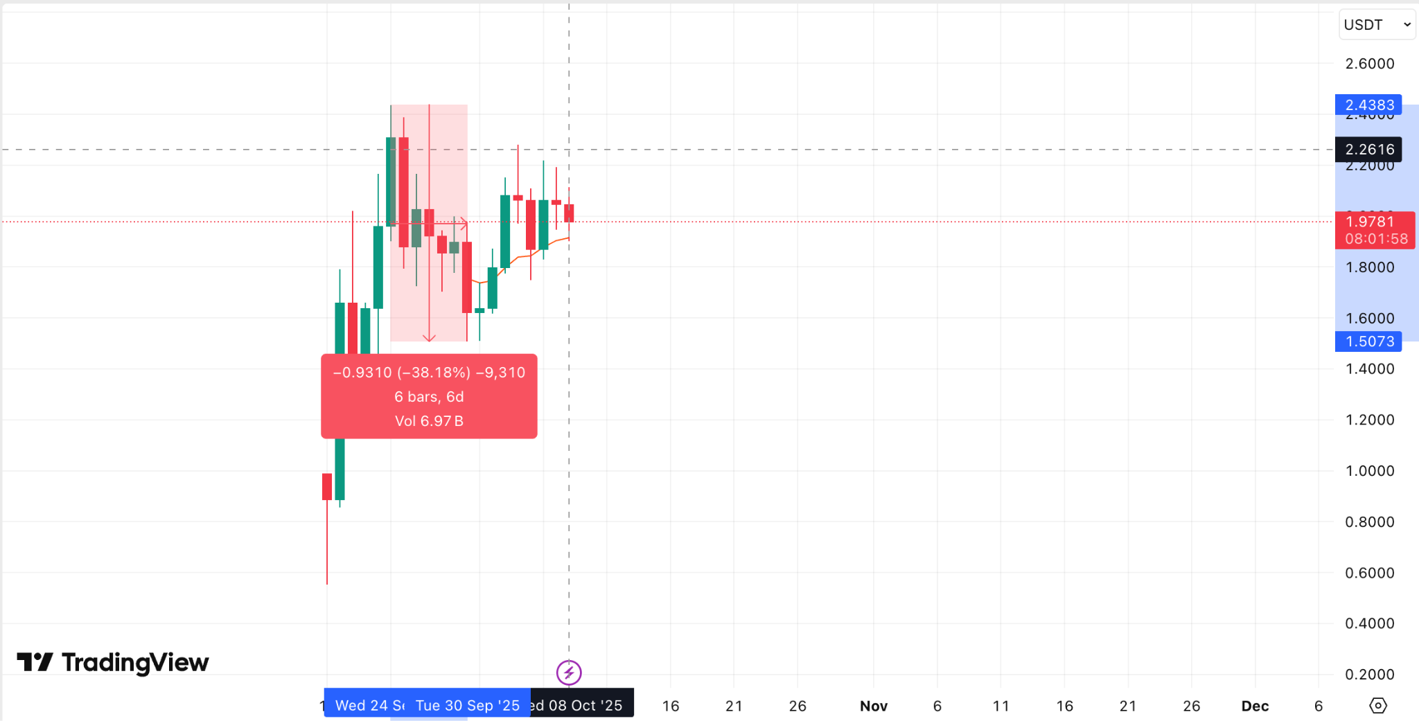 Sejak debut tokennya pada September 2025, ASTER mengalami lonjakan harga signifikan di masa awal, terlebih dengan cuitan CZ di X (Twitter) yang mengundang hype komunitas, sebelum akhirnya terkoreksi sekitar -38% dan kembali naik ke level $1.9. Fenomena ini umum terjadi pada proyek baru—antusiasme pasar biasanya diikuti fase penyesuaian ketika hype mulai menurun.