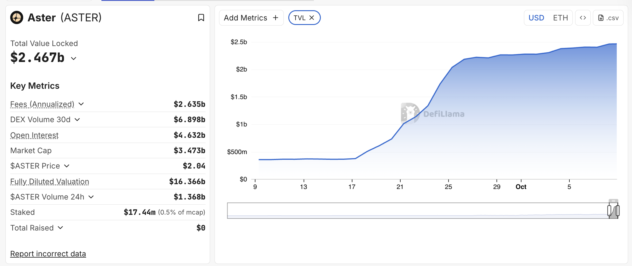 Dari segi metriks lain, volume perdagangan Aster sempat menembus angka tinggi di BNB Chain dan Arbitrum, sementara nilai total aset terkunci (TVL) meningkat pesat berkat dukungan dari komunitas likuiditas. Hingga artikel ini ditulis, TVL Aster masih stabil di atas $2 miliar dan masih terus bertambah.