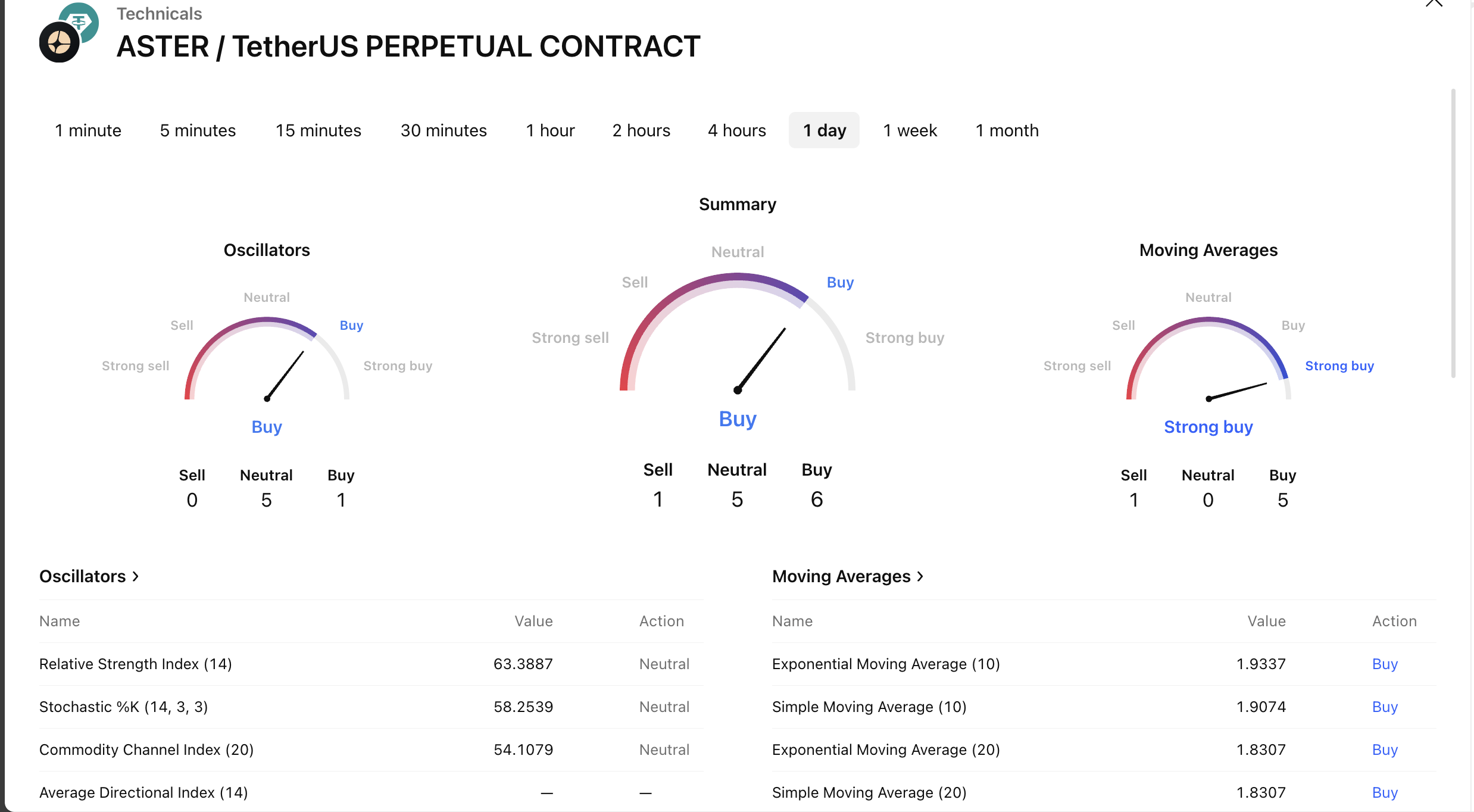 Menurut data TradingView, sinyal teknikal untuk ASTER/TetherUS Perpetual Contract menunjukkan kecenderungan Buy dengan dominasi indikator Moving Averages pada posisi Strong Buy.
