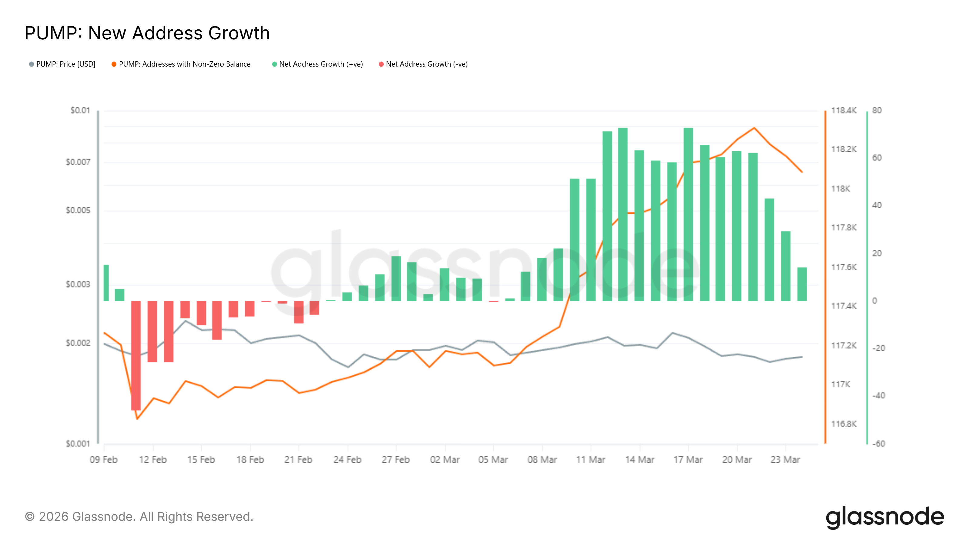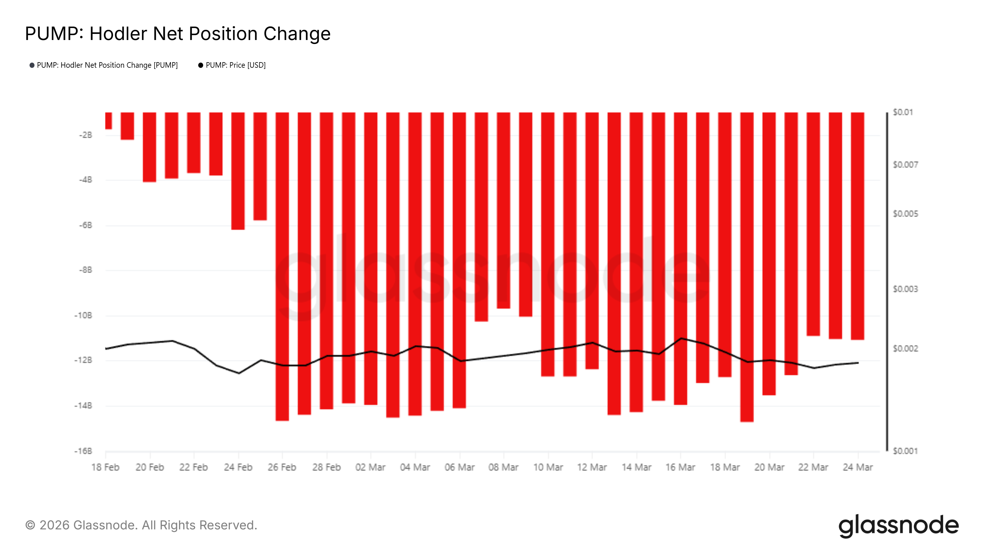 Data dari Glassnode menunjukkan bahwa sejak 18 Februari hingga 25 Maret 2026, long-term holders (LTH) PUMP terus melakukan aksi jual setiap hari tanpa satu pun hari akumulasi bersih.