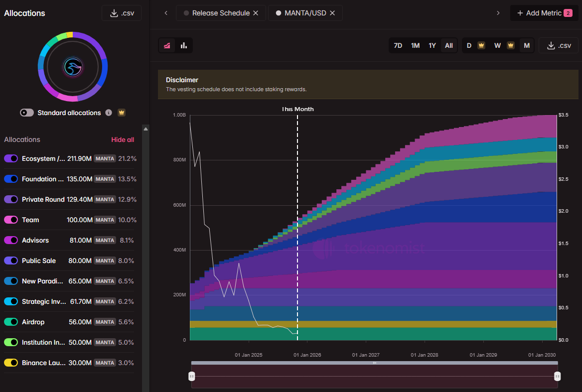 Berdasarkan data dari Tokenomist, pada saat peluncuran di Januari 2024 jumlah token yang beredar baru sekitar 253 juta. Namun, hanya dalam waktu kurang dari dua tahun, tepatnya pada November 2025, jumlah tersebut melonjak menjadi 543 juta token. Artinya, Manta mengalami inflasi suplai lebih dari 100% dalam periode singkat.