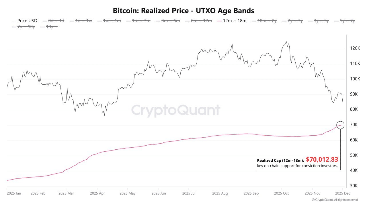 On-chain mengidentifikasi level $70.000 sebagai support Bitcoin yang paling kritis dalam siklus ini. Level ini bukan sekadar angka psikologis, melainkan mewakili “harga modal” (Realized Price) bagi investor dengan jangka panjang (pemegang 12โ18 bulan). ๐ก๏ธ