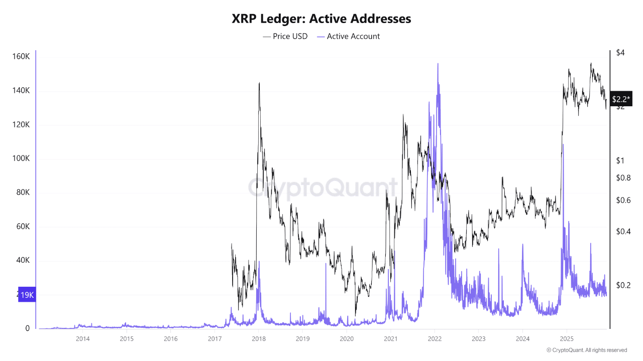 Data On-chain XRP menunjukkan akumulasi diam-diam (silent accumulation), di mana harga berhasil mempertahankan support $2,20 meskipun aktivitas jaringan (active addresses) anjlok ke level terendah tahunan (~19,4 ribu).