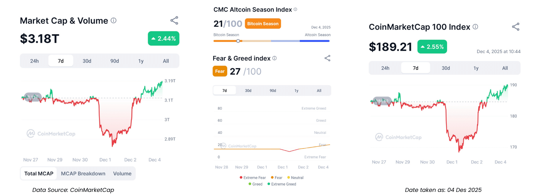 Pasar kripto minggu ini menunjukkan upaya pemulihan yang tentatif setelah periode tekanan yang berat. Market Cap & Volume naik ke level $3.18 Triliun (+2.44%). CoinMarketCap 100 Index juga mencatat kenaikan ke $189.21 (+2.55%). Meskipun demikian, sentimen pasar Fear & Greed Index naik sedikit di level 27. CMC Altcoin Season Index justru turun ke angka 21/100. Ini menunjukkan bahwa meskipun pasar mulai menghijau, pemulihan ini hampir seluruhnya didorong oleh Bitcoin (‘Bitcoin Season’), sementara altcoin masih kesulitan mendapatkan kenaikan yang signifikan.