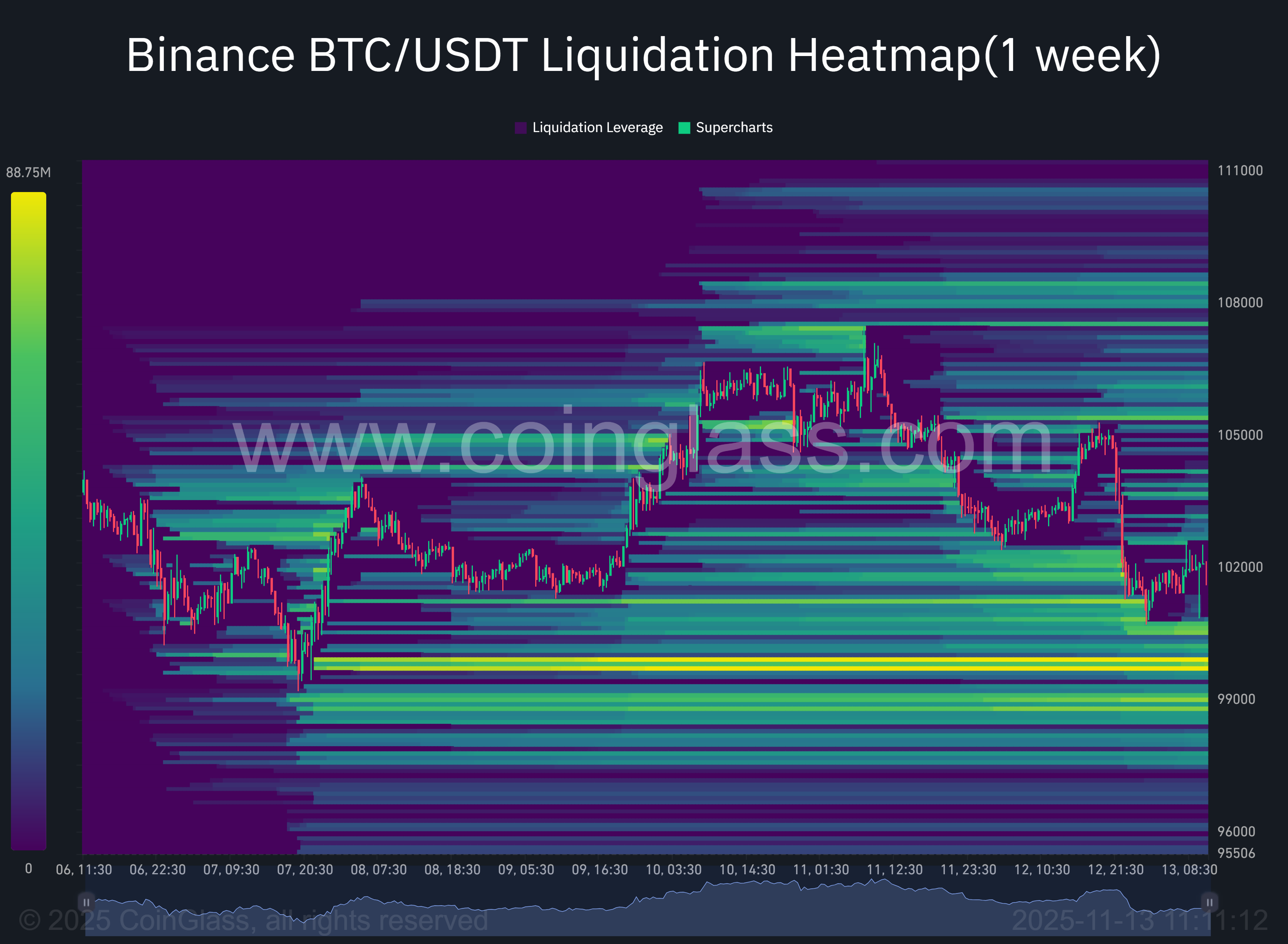 Pasar sedang dalam fase “pencarian dasar” setelah kejatuhan tajam dari level $108.000. Harga kini terkunci dalam rentang perdagangan baru yang lebih rendah, dengan zona likuiditas yang jelas terbentuk di atas dan di bawah level harga saat ini (~$102.500). ๐