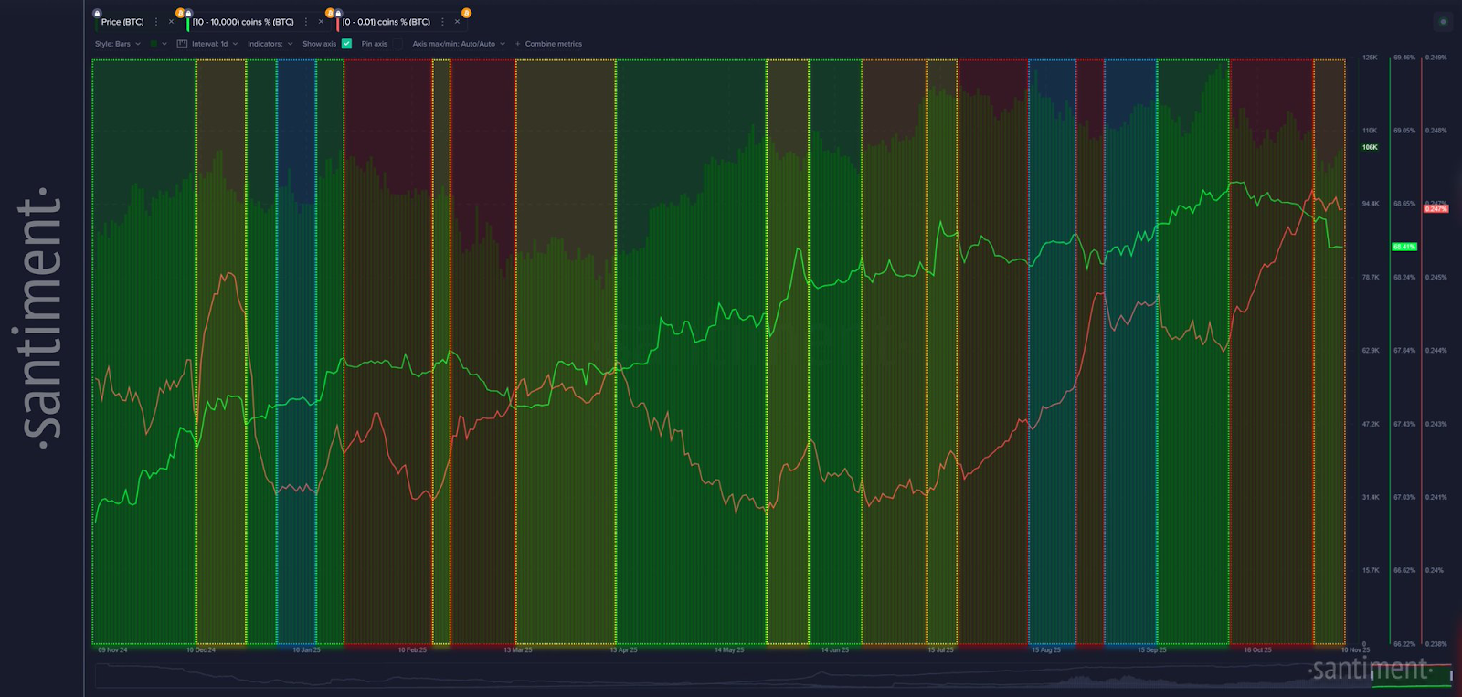 Data on-chain dari Santiment menunjukkan sinyal bearish yang mengkhawatirkan. Berbeda dari biasanya, whale Bitcoin (pemegang 10-10.000 BTC) kini terlihat menjual aset mereka bersamaan dengan investor ritel. Pergerakan satu arah ini menunjukkan tekanan kapitulasi yang meluas dan dapat menunda pemulihan pasar. ๐