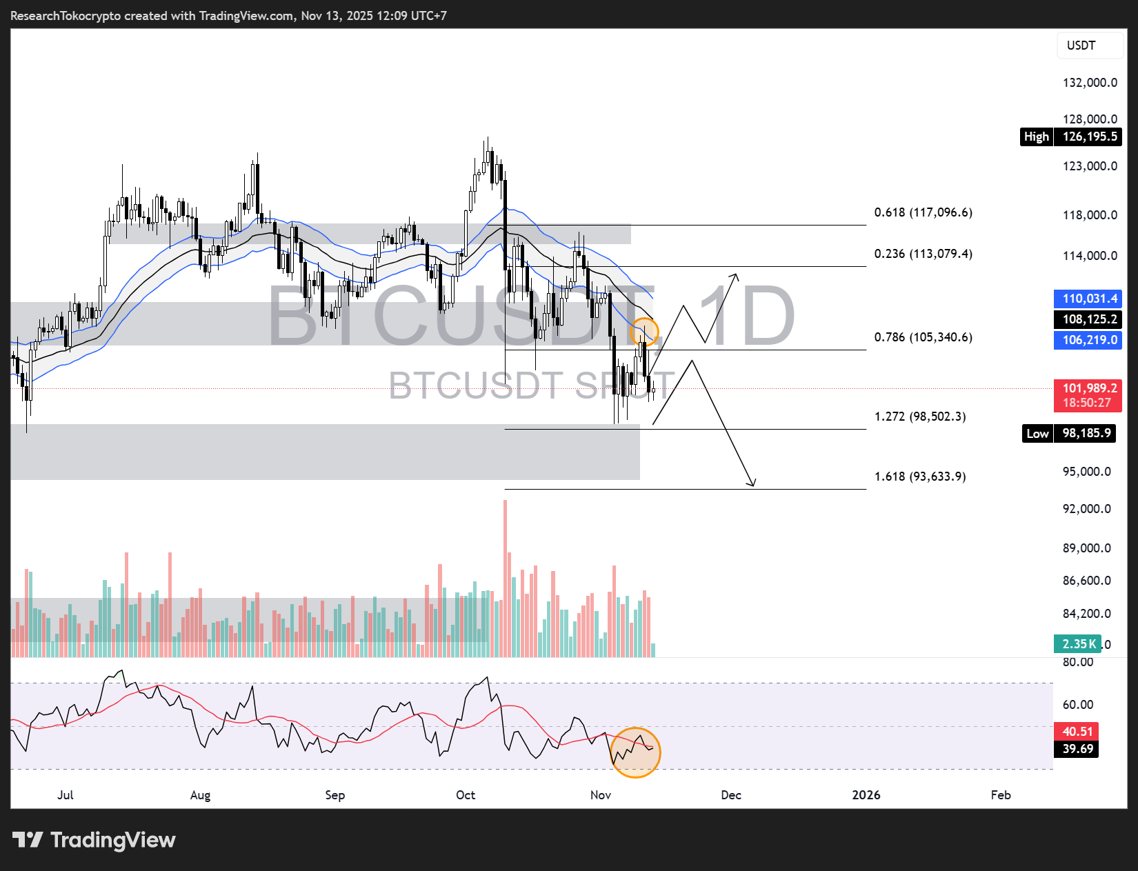 - Harga Bitcoin pada timeframe daily menujukkan pelemahan dan belum adanya perubahan struktur bullish.
