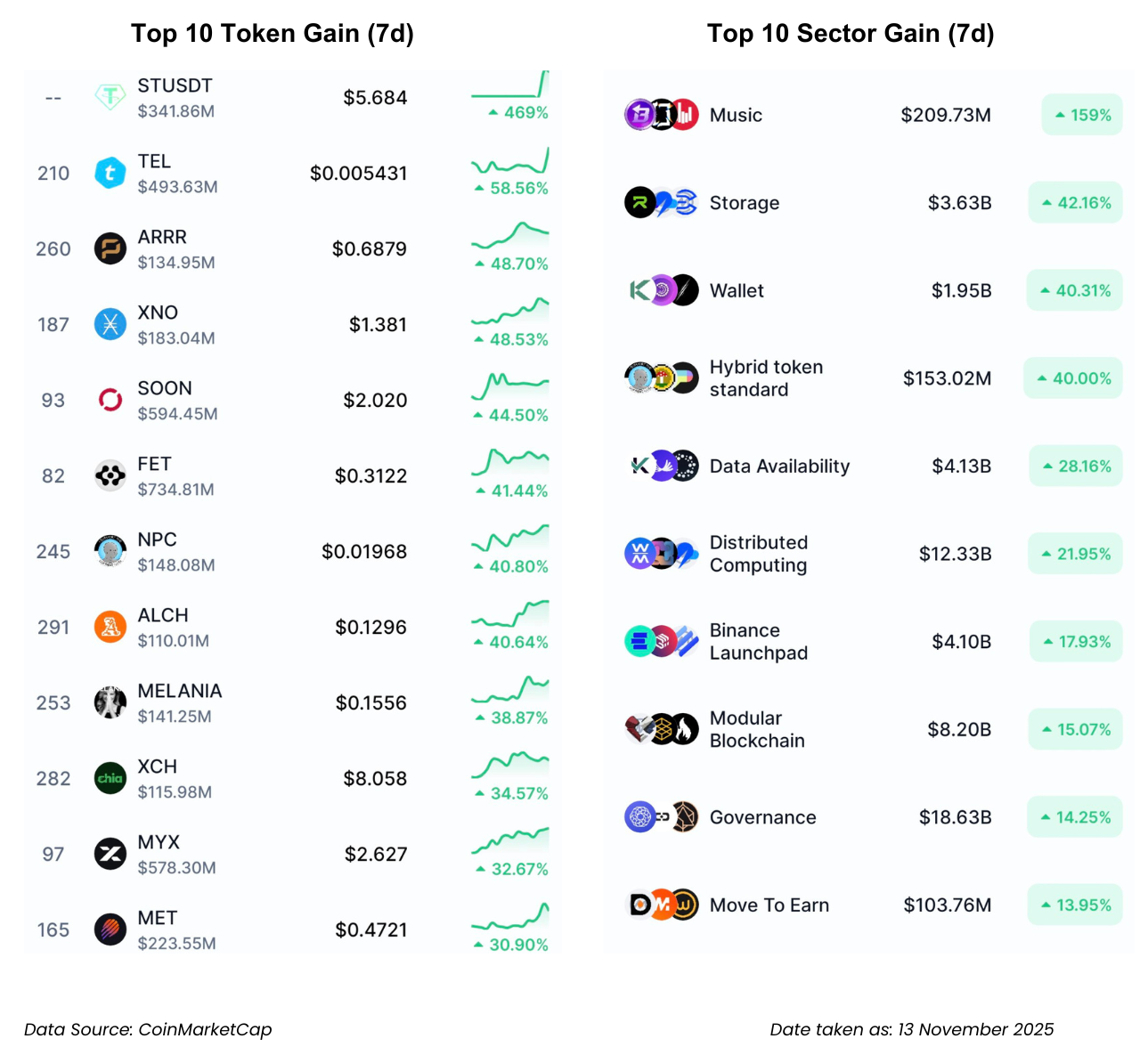 - Fokus pada Infrastruktur Inti (AI, DePIN & Utilitas) ๐๏ธ Sektor infrastruktur fundamental menunjukkan kekuatan solid. Kenaikan Storage (+42.16%), Data Availability (+28.16%) (didukung oleh Fetch.ai (FET) dan Chia (XCH)), serta Wallet (+40.31%) menegaskan bahwa narasi AI, DePIN, dan utilitas inti tetap sangat diminati oleh investor.