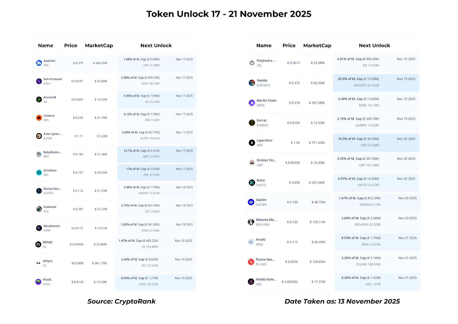 Memasuki minggu ketiga November, kalender unlock token untuk periode 17-21 November mencatat 25 proyek yang akan merilis suplai. Minggu ini akan menjadi periode yang sangat volatil, dengan beberapa unlock berskala besar dan menengah yang dijadwalkan, yang berpotensi menciptakan gejolak harga dan menguji kekuatan serap pasar.