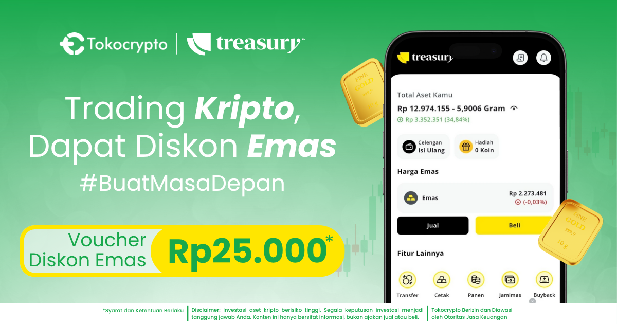Tokocrypto bekerja sama dengan Treasury.id memberikan voucher diskon emas digital Rp25.000 untuk pengguna baru Treasury.