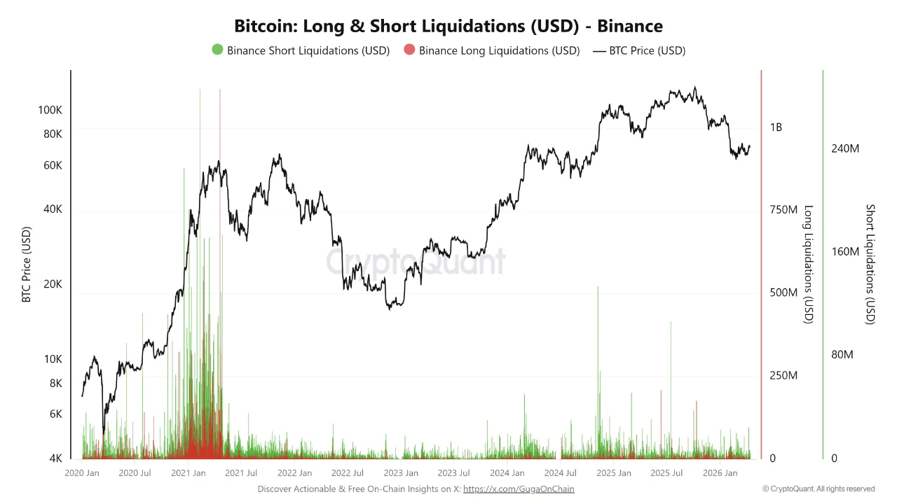 - Kerusakan Besar Akibat Likuidasi: Sesuai grafik likuidasi historis, dominasi short ini memicu kerugian massal. Kenaikan harga yang tipis saja telah menyapu bersih posisi short (bar hijau) hingga mencapai US$5,25 juta di Binance, jauh melampaui likuidasi *long* (bar merah) yang hanya US$2,01 juta.