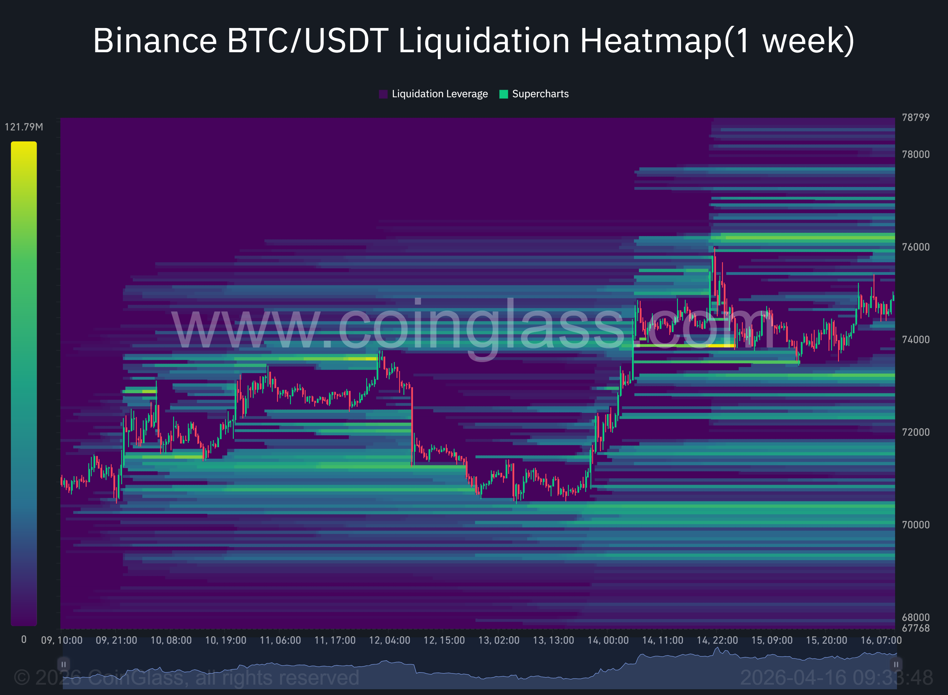 - Secara struktural, harga BTC memiliki probabilitas tinggi untuk memburu klaster likuiditas tebal di atas US$76.000 terlebih dahulu guna memicu short squeeze lanjutan.