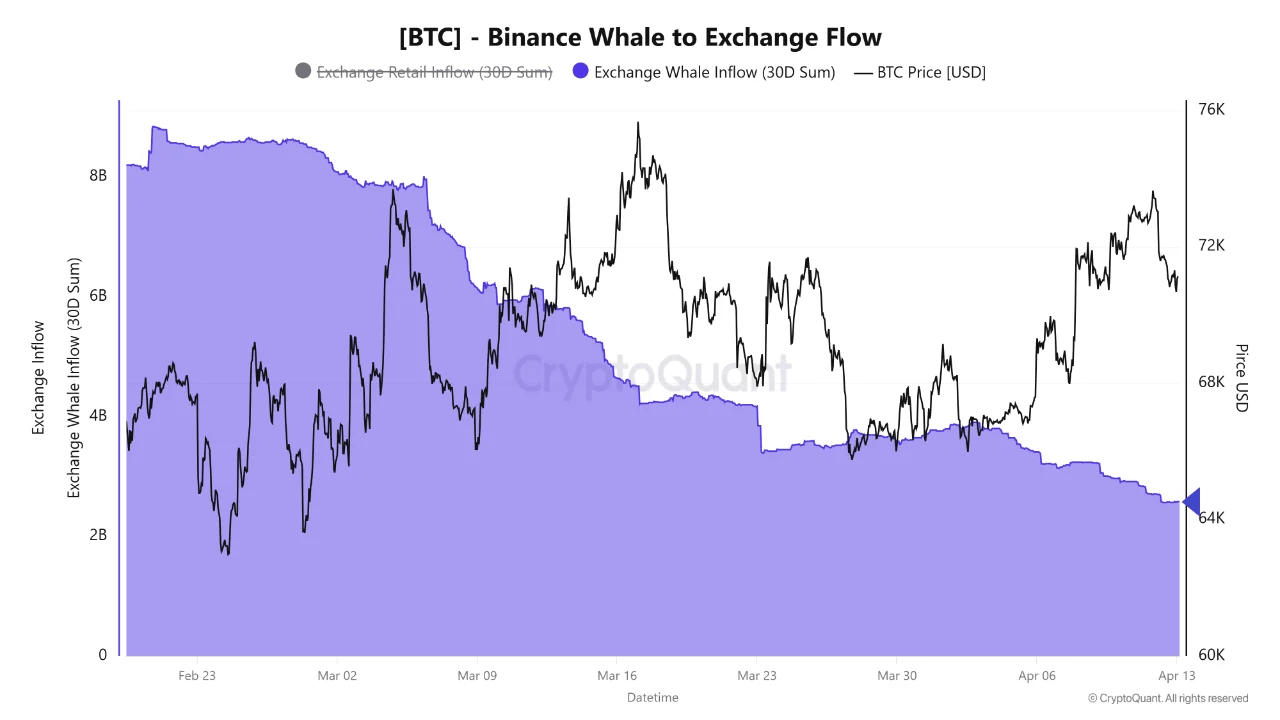 - Tekanan Jual Whale Mereda: Seperti yang terlihat pada area ungu di grafik, aliran masuk Bitcoin dari investor besar (Whale) ke bursa Binance terus menyusut secara konsisten. Metrik Whale Exchange Inflow 30 hari telah turun drastis ke sekitar US$2,58 miliar pada 13 April (level terendah yang mendekati Juni 2025), menandakan para “paus” kini lebih memilih menahan asetnya daripada menjualnya di bursa.