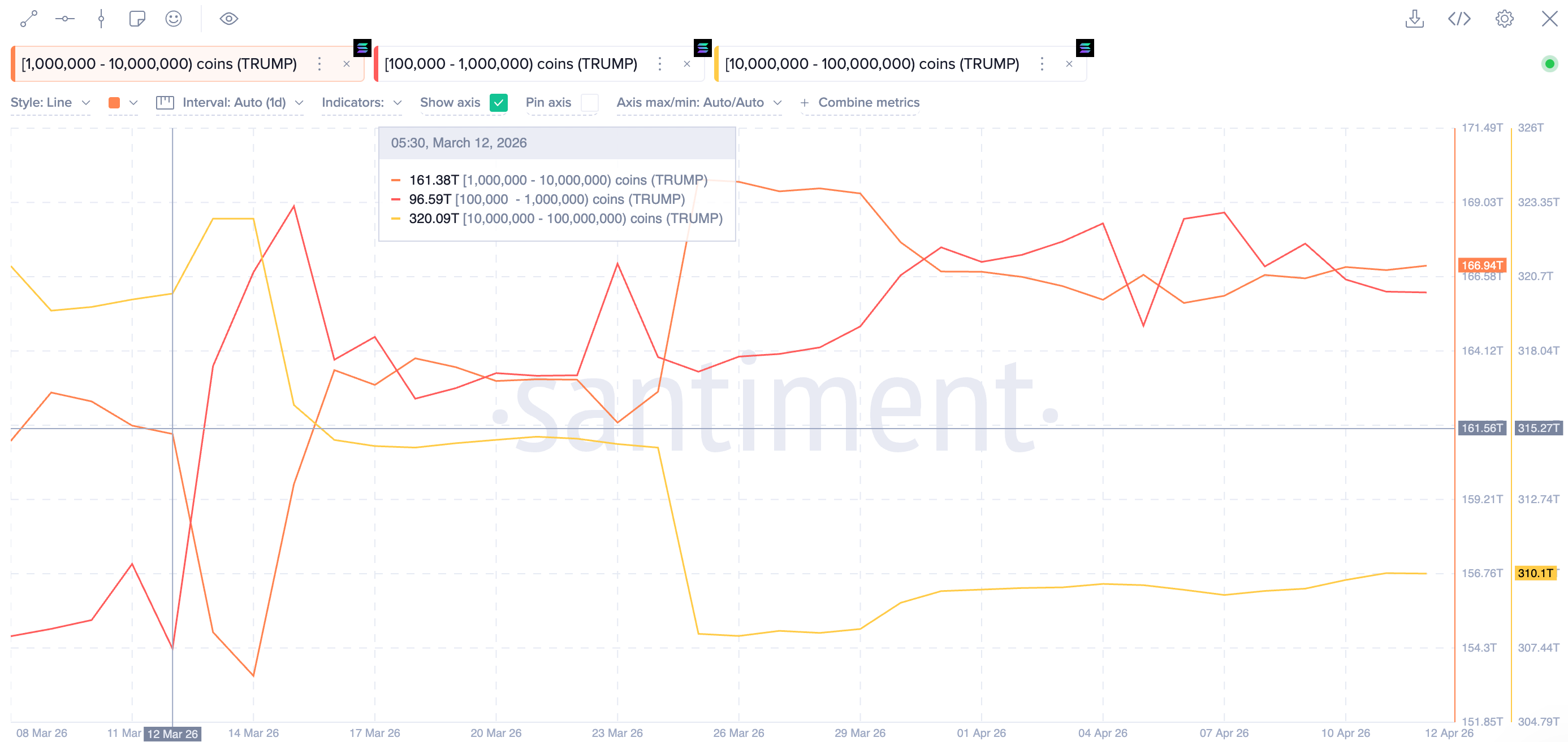 Data on-chain token TRUMP terus menguat menjelang acara Mar-a-Lago 25 April, dengan satu wallet menarik 850.488 TRUMP senilai sekitar US$2,4 juta dari Bybit dan wallet lain menarik 105.754 TRUMP dari Binance. Data Santiment juga menunjukkan redistribusi supply yang jelas, di mana holder terbesar sempat memangkas posisi sejak 12 Maret tetapi akumulasi kembali muncul setelah 12 April, meskipun harga justru jatuh di bawah US$3 dan sudah turun lebih dari 41% sepanjang 2026.